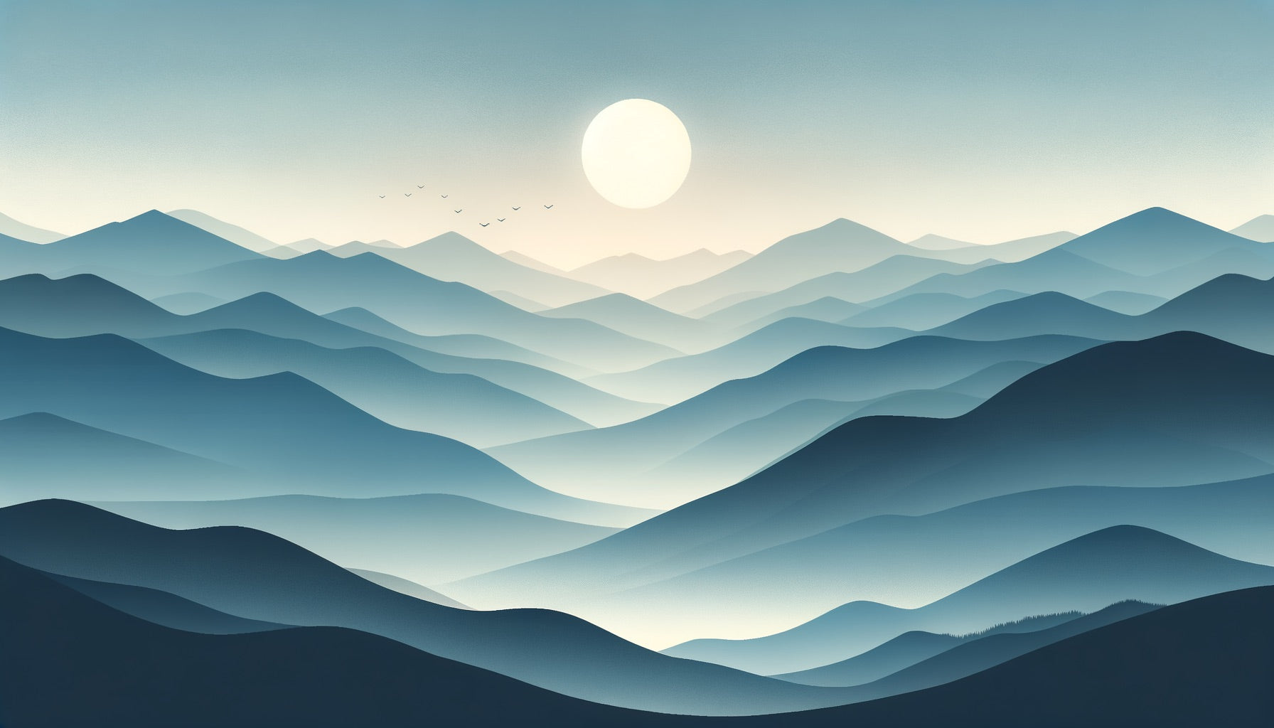 Diese Berglandschaft Tapete fängt die ätherische Schönheit von sanft geschwungenen Gipfeln im Morgenlicht ein. Schicht um Schicht blau getönter Berge erzeugt einen faszinierenden Tiefeneffekt, während eine leuchtende Sonne in einem sanften cremefarbenen Himmel schwebt. Die sanften Farbverläufe von Türkis und Azur verschmelzen nahtlos und schaffen ein panoramisches Bergwandbild, das den Blick in seine friedliche Weite zieht.
