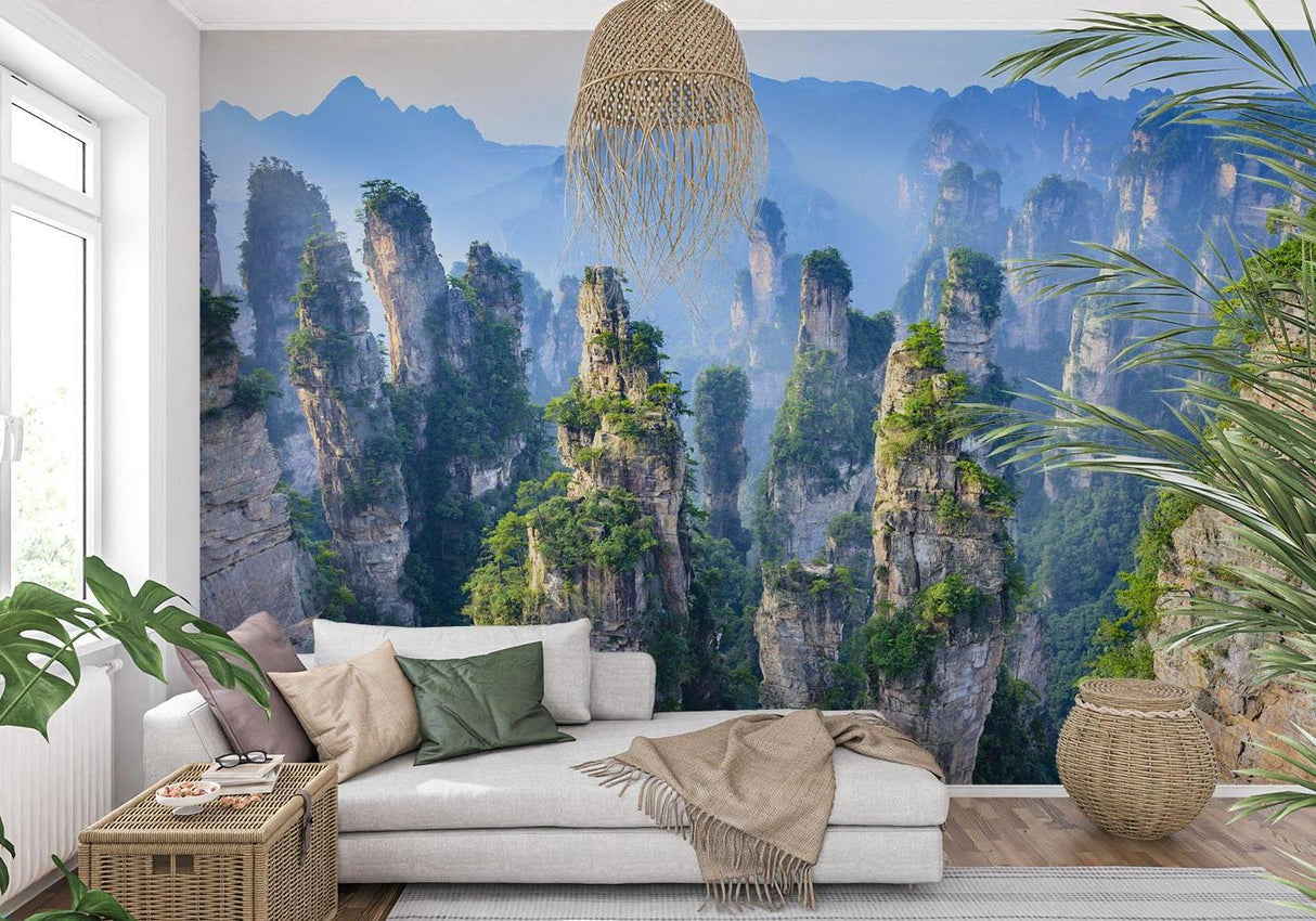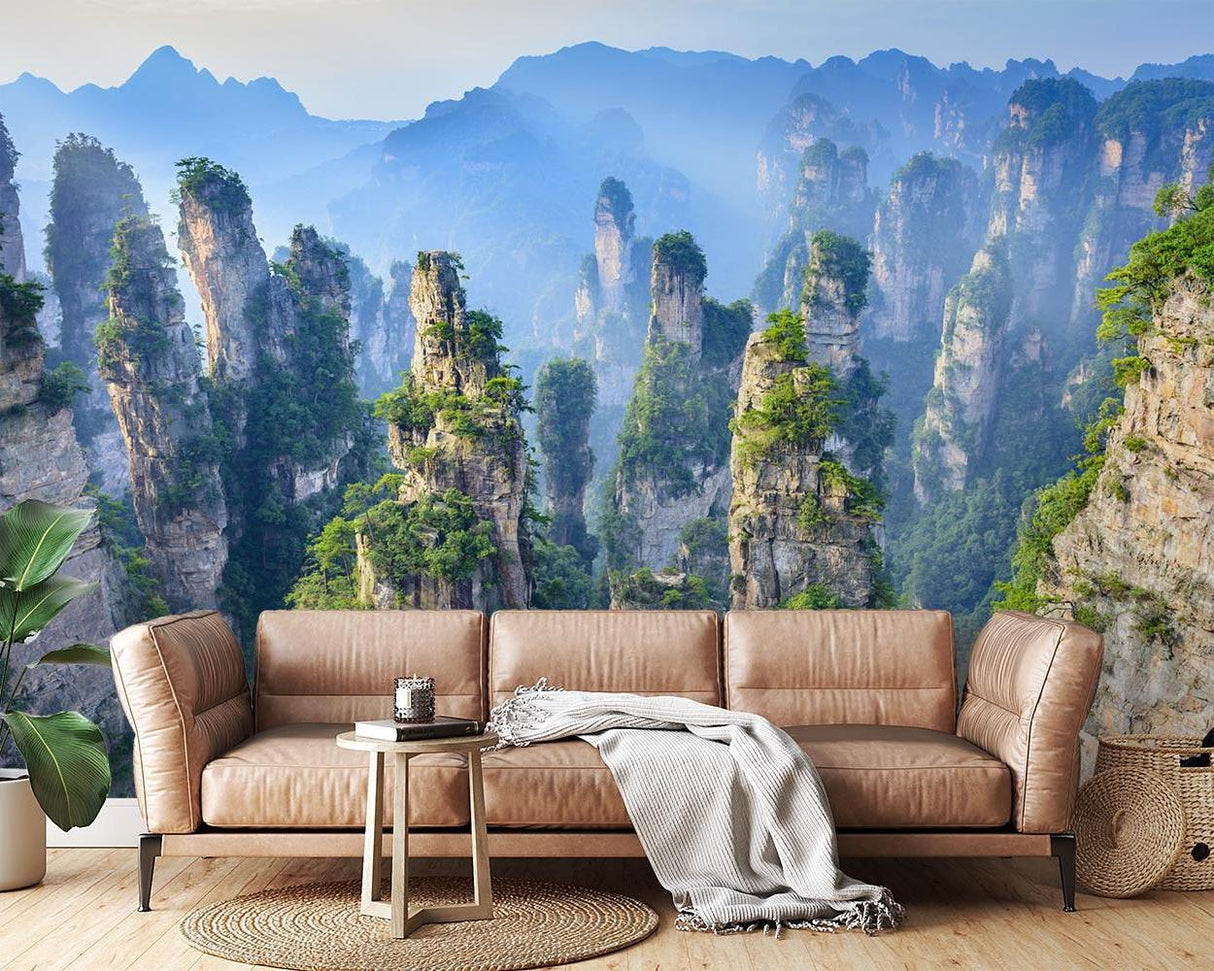 Diese Berglandschaft Tapete fängt die atemberaubende Majestät der hoch aufragenden Kalksteinsäulen ein, die durch neblige blaue Tiefen ragen. Die dramatischen vertikalen Formationen, geschmückt mit üppiger Vegetation, schaffen eine ehrfurchtgebietende Szene direkt aus Chinas legendären Landschaften. Jede Säule steht als natürliches Denkmal, perfekt detailliert in dieser panoramen Bergtapete, wo Sonnenlicht über die felsigen Oberflächen spielt, um subtile Texturen und Tiefen zu enthüllen.
