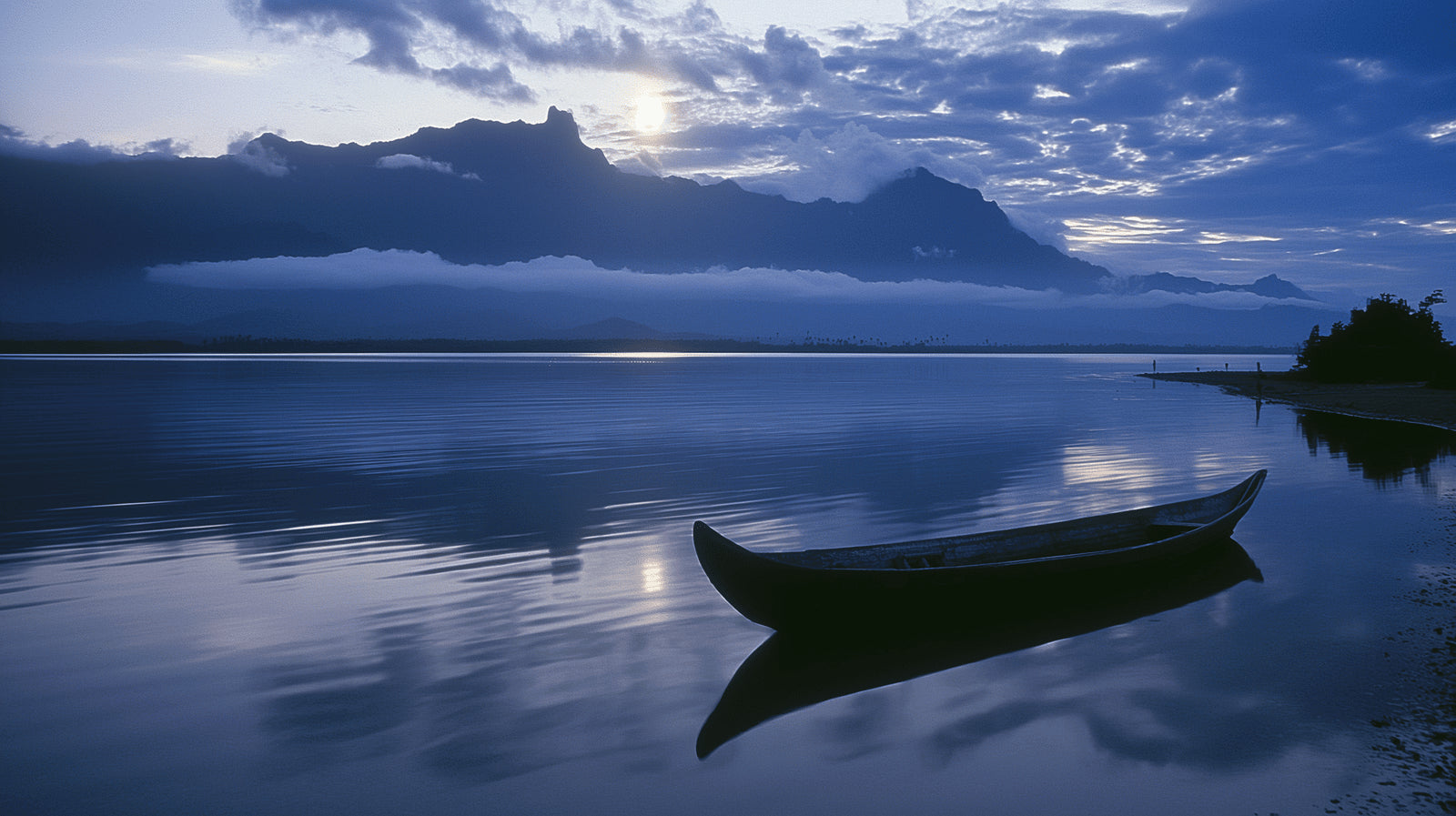 Diese Bergsee-Tapete fängt die ätherische Schönheit der Natur in ihrem friedlichsten Moment ein. Die majestätischen Berge erheben sich durch Wolkenfetzen, ihre Silhouetten dramatisch gegen den Dämmerungshimmel. Ein makelloser See spiegelt das himmlische Schauspiel wider, während ein einsames Holzboot die Szene in stiller Kontemplation verankert. Die panoramische Landschaftstapete zeigt tiefe Blautöne und silbrige Reflexionen und schafft ein Meisterwerk natürlicher Harmonie.