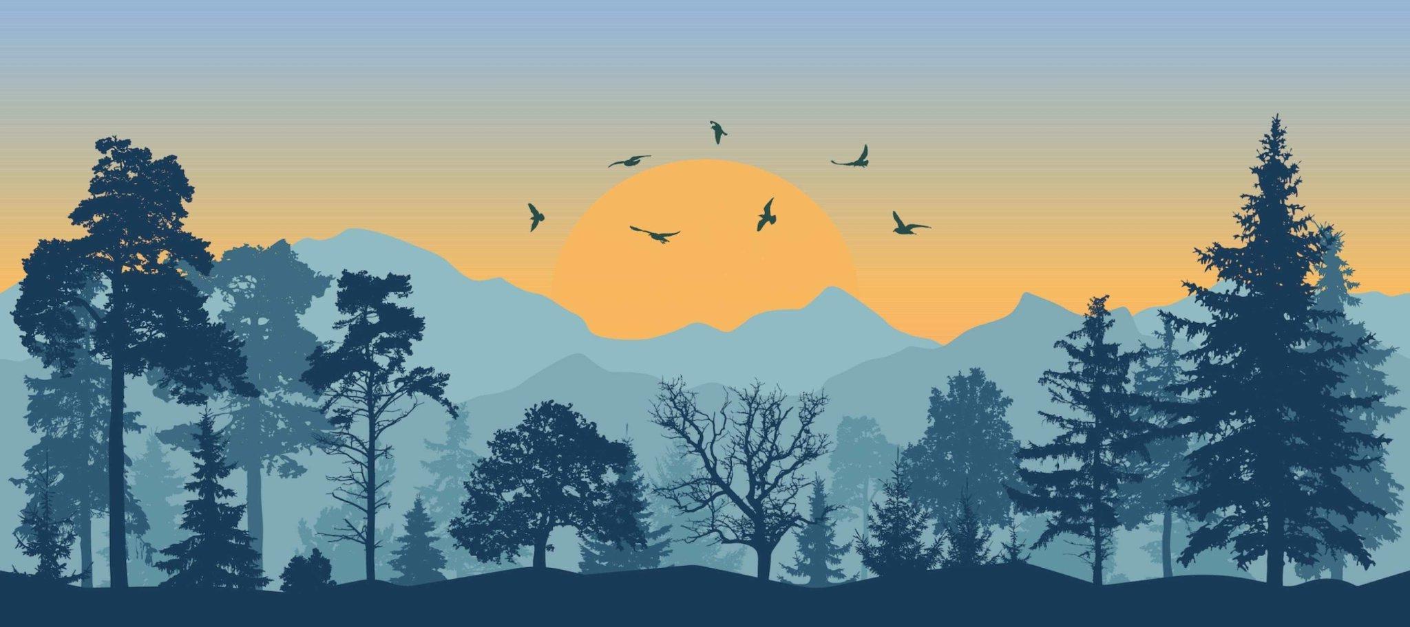 Bergwald Tapete | Sonnenuntergang Vögel und Kiefern