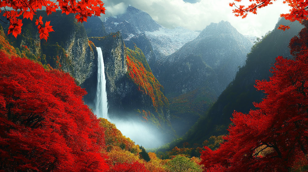 Diese Berglandschaft Tapete fängt die Großartigkeit der Natur in ihrer schönsten Form ein und zeigt einen majestätischen Wasserfall, der über hohe Klippen inmitten eines Farbenspiels aus Herbstfarben herabstürzt. Der dramatische Kontrast zwischen den leuchtend roten Ahornblättern und den neblig blau-grauen Bergen schafft einen faszinierenden Blickfang. Die Wasserfall Wandbild Tapete zeigt unberührte, schneebedeckte Gipfel, die durch sanfte Wolken hervortreten, während goldenes Sonnenlicht die gesamte Szene in ein warmes, ätherisches Licht taucht.