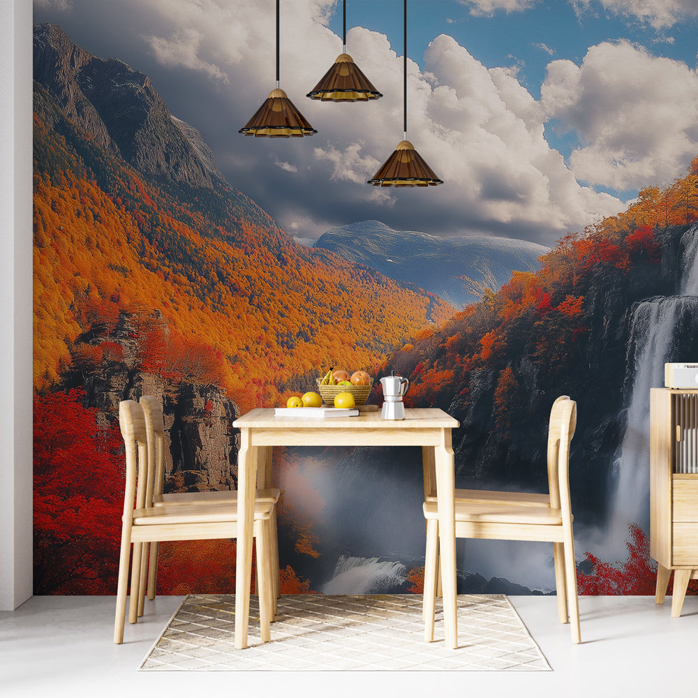 Diese Berglandschaft Tapete fängt die dramatischste saisonale Darstellung der Natur ein, bei der hoch aufragende Klippen einen majestätischen Wasserfall umarmen, umgeben von leuchtenden Herbstfarben. Tiefrote Ahornbäume und gold-orangefarbenes Laub schaffen eine spektakuläre Leinwand vor rauen Felswänden, während wehende Wolken über den azurblauen Himmel tanzen. Das Wasserfall Wandbild fügt ein dynamisches Element hinzu, dessen nebliger Wasserfall einen schönen Kontrast zur lebendigen Herbstpalette bildet.