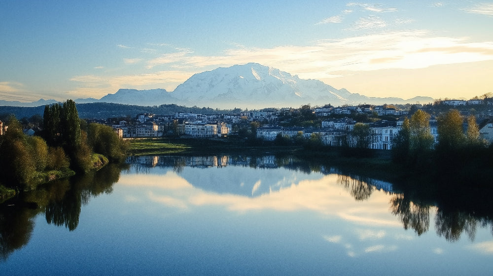 Diese Berglandschaft Tapete fängt die atemberaubende Majestät schneebedeckter Gipfel ein, die bei Tagesanbruch über einer ruhigen Seenstadt emporragen. Die Komposition balanciert meisterhaft den imposanten alpinen Gipfel mit seiner Spiegelung im stillen Wasser darunter und schafft so ein Gefühl perfekter Symmetrie. Der sanft blaue Himmel verschmilzt mit goldenem Morgenlicht, während die panoramische Bergsicht die Szene mit ihren makellosen weißen Gipfeln und dramatischer Silhouette dominiert.