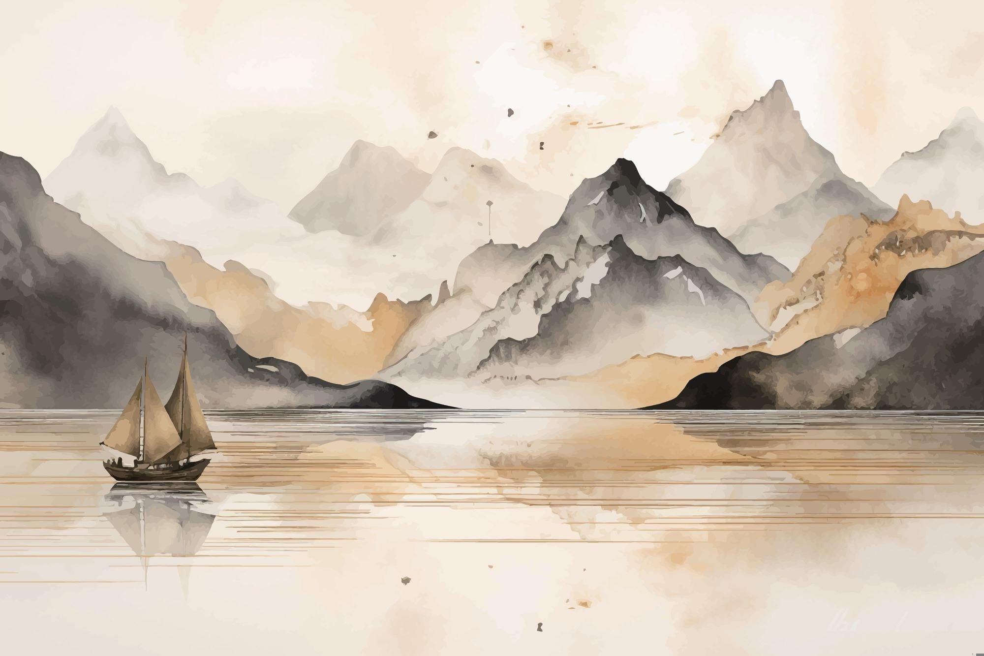 Diese Berglandschafts-Tapete zeigt ein faszinierendes Aquarell-Panorama, in dem majestätische Gipfel durch neblige Höhen aufsteigen. Die raffinierte Farbpalette verbindet sanfte Beige- und warme Goldtöne mit tiefen Kohleschatten und schafft so eine harmonische Komposition. Ein kleines Segelboot gleitet über den ruhigen See und verleiht diesem malerischen Bergwandbild eine erzählerische Note. Die zarte Pinselarbeit und die ätherische Atmosphäre fangen das Wesen der traditionellen asiatischen Landschaftskunst ein.