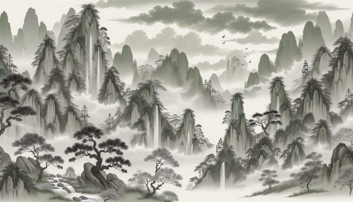 Diese Berglandschaft Tapete fängt die ätherische Schönheit der traditionellen japanischen Kunst ein, wo majestätische Gipfel durch rollenden Nebel und Wolken auftauchen. Die monochrome Palette in subtilen Grautönen schafft eine faszinierende Tiefe, während zarte Kiefern an dramatischen Klippen haften. Anmutige Wasserfälle stürzen das felsige Gelände hinab, und Vögel schweben durch die neblige japanische Berglandschaft, was dieser ruhigen Komposition Bewegung verleiht.
