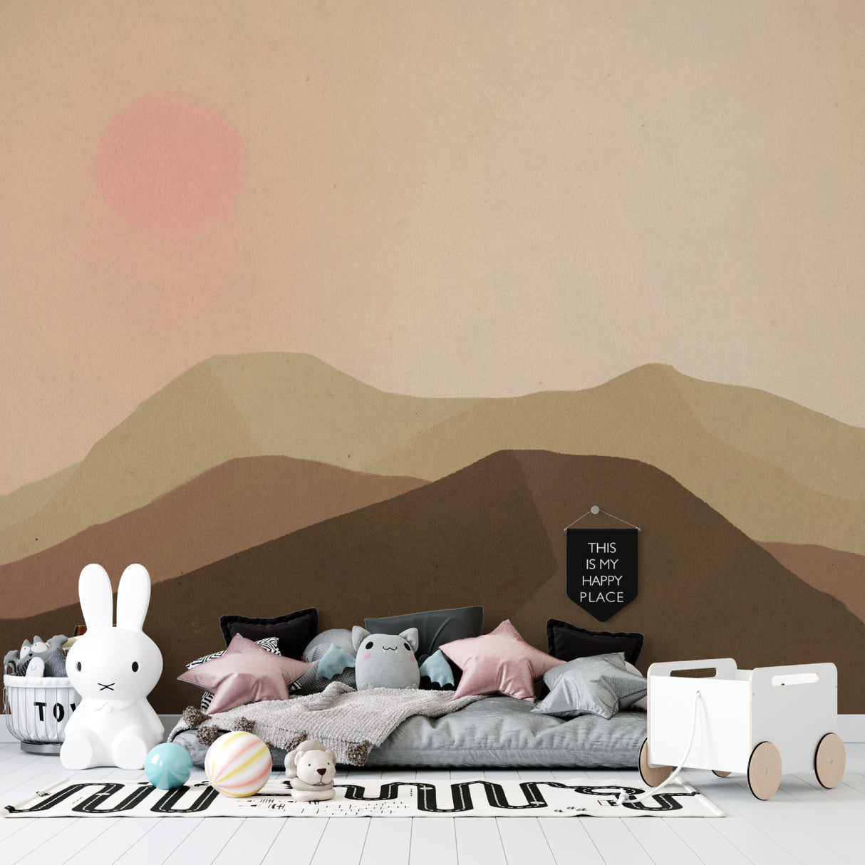 Diese Berglandschaft Tapete fängt die ruhige Schönheit sanfter Hügel unter einer sanften rosa Sonne ein. Das Design zeigt Schichten erdiger Berge in harmonischen Braun- und Beigetönen und schafft eine friedliche Tiefe, die das Auge in seinen ruhigen Horizont zieht. Die Wüsten-Sonnenuntergang Tapete zeigt weiche, verlaufende Farben, die nahtlos ineinander übergehen und ein anspruchsvolles, aber beruhigendes visuelles Erlebnis bieten.