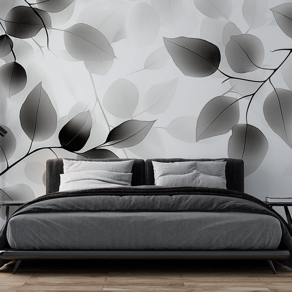 Verwandeln Sie Ihren Raum mit diesem zeitgenössischen Blätterwandbild, das jedem Interieur ein Gefühl von Ruhe und natürlicher Eleganz verleiht. Das schwarz-weiße Tapetendesign bietet vielseitige Raffinesse, die moderne, minimalistische und traditionelle Einrichtungsstile gleichermaßen bereichert. Seine sanfte Bewegung und ausgewogene Komposition schaffen eine friedliche Atmosphäre und fügen Ihren Wänden künstlerische Tiefe und visuelles Interesse hinzu.