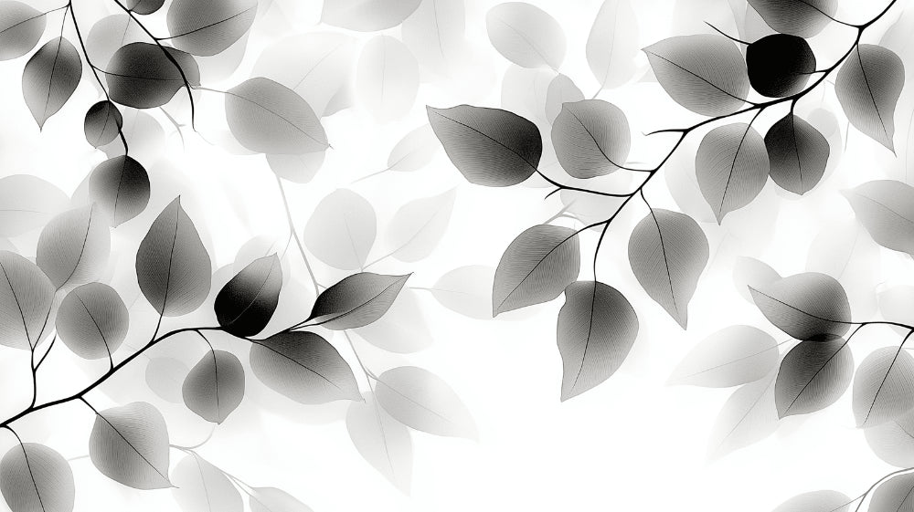 Diese monochrome Blättertapete fängt die ätherische Schönheit der Natur durch ein raffiniertes Spiel von Licht und Schatten ein. Zarte Blätter schweben anmutig vor einem makellosen weißen Hintergrund, ihre durchscheinenden Formen in verschiedenen Grautönen und Schwarz dargestellt. Das botanische Wandbild schafft eine künstlerische Komposition, in der jedes Blatt wie in schwebender Animation zu tanzen scheint, mit feinen Details, die die filigranen Adern und organischen Formen des Laubs offenbaren.