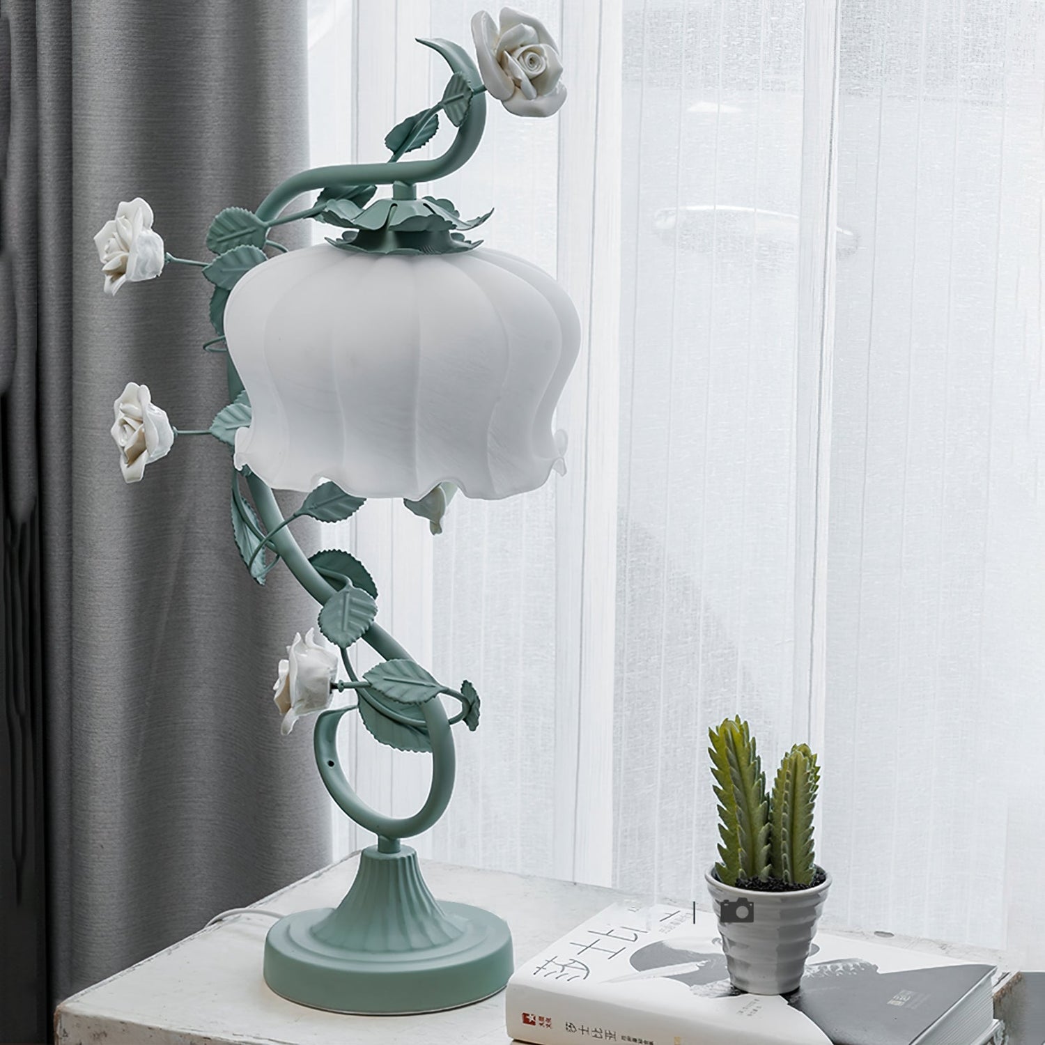 Blumen-Tischlampe | Geschwungenes grünes Metall-Design mit Glasschirm