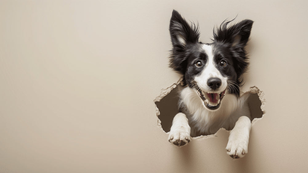 Diese Border-Collie-Tapete zeigt einen charmanten schwarz-weißen Hundebegleiter, der in einer verspielten 3D-Illusion durch die Wand bricht. Die detaillierte Darstellung erfasst jeden Aspekt dieser intelligenten Rasse, von den markanten Gesichtszügen bis zu den ausdrucksvollen Augen und dem flauschigen Fell. Vor einem sanften beigen Hintergrund schafft diese 3D-Hundetapete eine beeindruckende visuelle Wirkung mit realistischer Tiefe und Dimension.