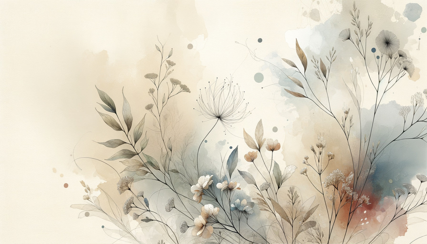 Dieses botanische Wandbild fängt die ätherische Schönheit der Natur mit seiner zarten Komposition aus wilden Kräutern und Löwenzahnblüten ein. Vor einem weichen beigen Hintergrund zeigt das Aquarell-Design durchscheinende Blätter in gedämpftem Salbeigrün und Taupe, neben anmutigen Blumenstielen und filigranen Samenständen. Das blumige Tapetenwandbild enthält sanfte blaue Punkte und subtile Wasch-Effekte, die Tiefe und Bewegung in der Szene erzeugen.