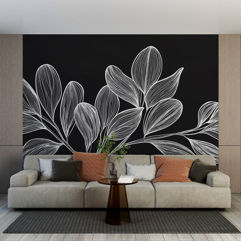 Unser schwarz-weißes Blätter-Mural schafft eine eindrucksvolle visuelle Tiefe.