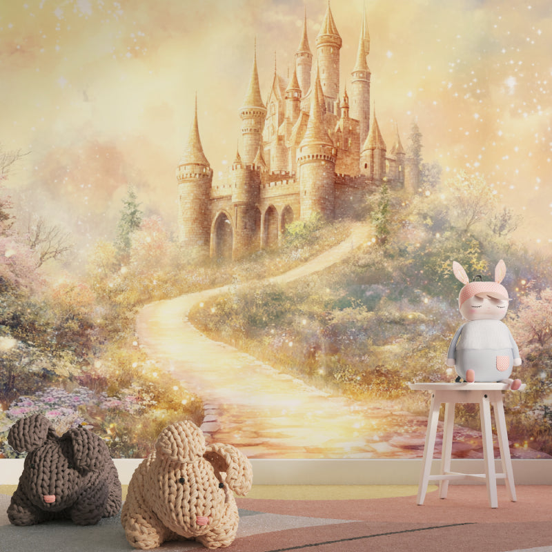 Diese Fantasy-Schloss-Tapete entführt Betrachter in ein magisches Reich, in dem Träume Gestalt annehmen. Vor einem warmen, goldfarbenen Himmel erhebt sich das majestätische Schloss mit seinen eleganten Türmen und Zinnen, umgeben von mystischem Nebel und blühendem Laubwerk. Das verzauberte Schloss-Wandbild zeigt zarte Details in sanften Beigetönen und schafft mit seinem gewundenen Pfad und funkelnden Highlights, die durch die Szene zu tanzen scheinen, eine ätherische Atmosphäre.