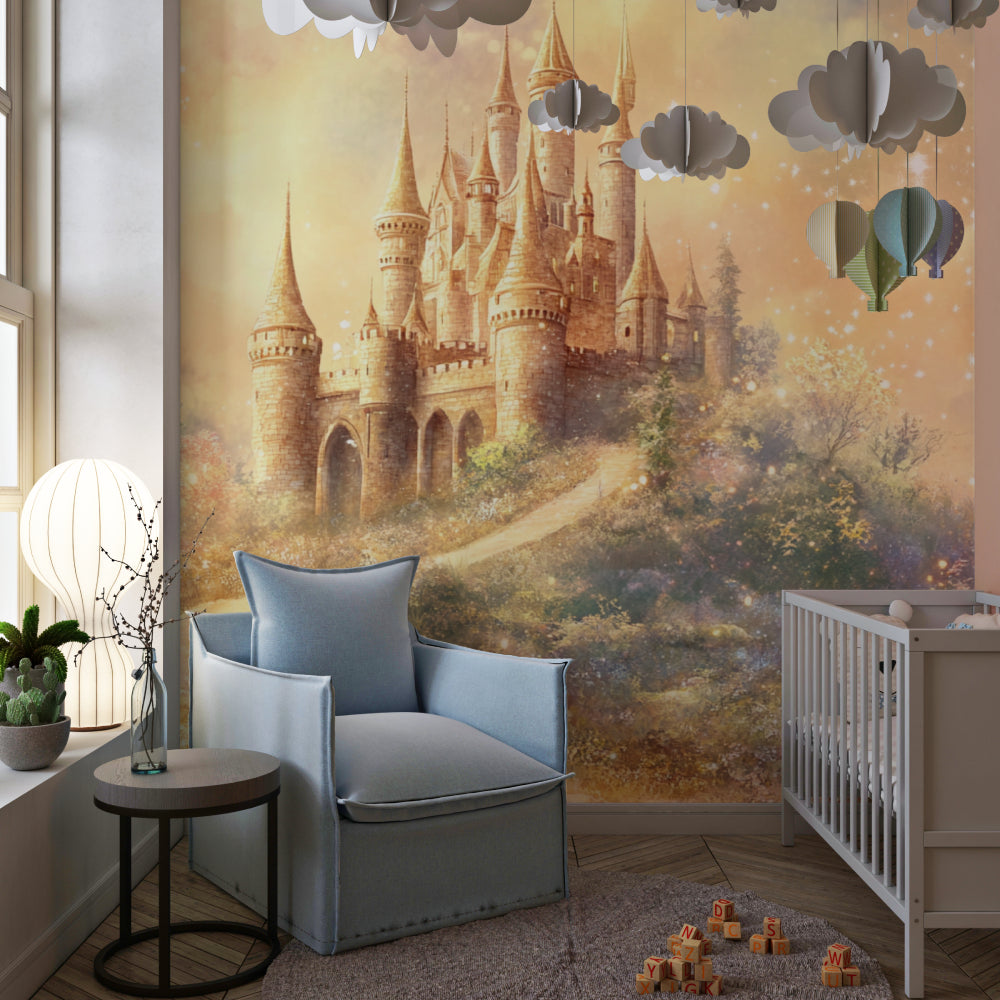 Beobachten Sie, wie diese verzauberte Schloss-Tapete einen sicheren Raum für Träume schafft.
