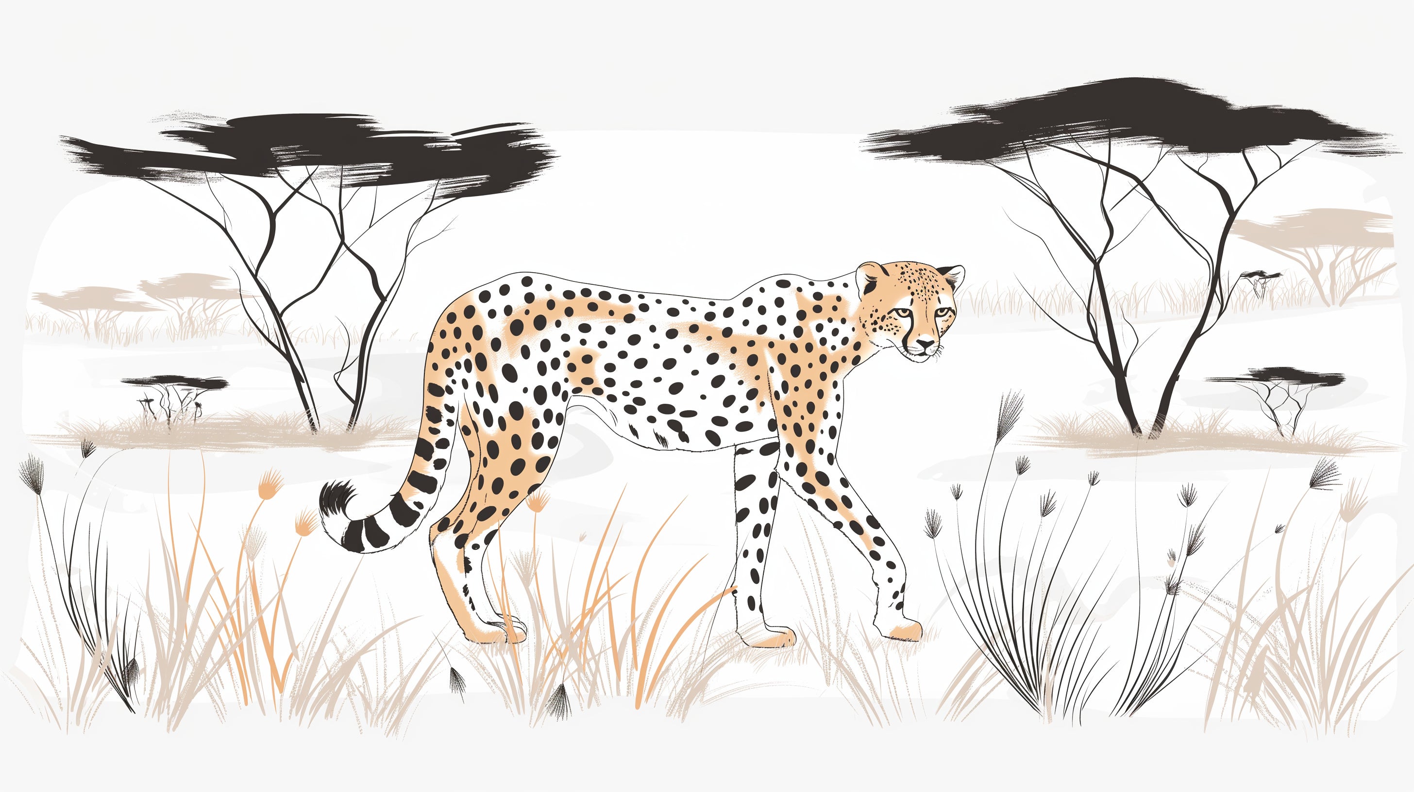Dieses Geparden-Tapeten-Mural bringt die ungezähmte Schönheit der afrikanischen Savanne in Ihren Raum. Die elegante Großkatze, dargestellt in sanftem Beige und schwarzen Flecken, steht vor einem minimalistischen Landschaftshintergrund. Anmutige Akazienbäume mit ausladenden schwarzen Kronen rahmen die Szene ein, während zarte Grasstängel in gedämpften Tönen ein Gefühl von Bewegung und Tiefe in diesem afrikanischen Tierwelt-Tapetenmural erzeugen.