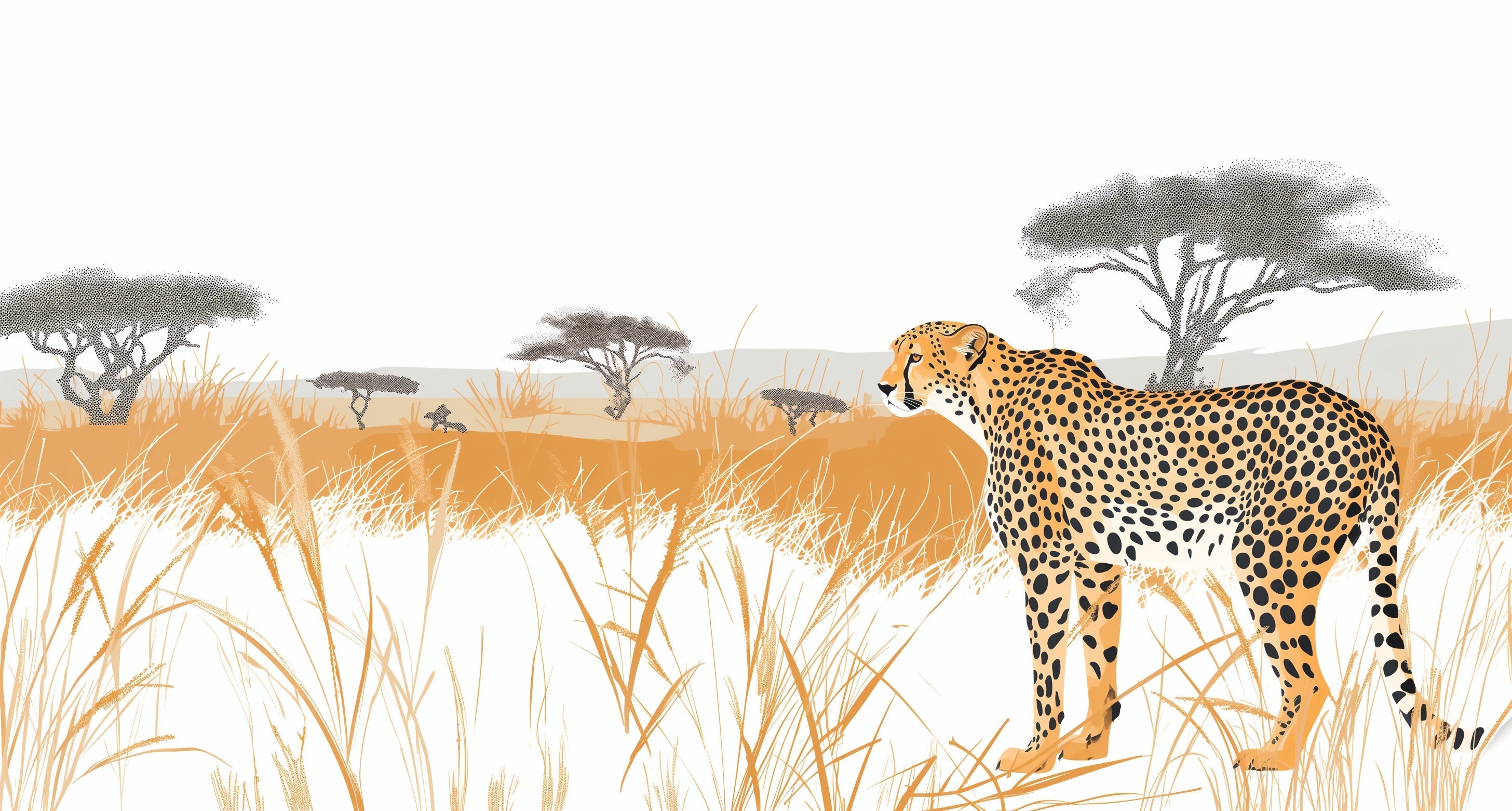 Diese afrikanische Savannen-Tapete zeigt einen majestätischen Geparden, der aufmerksam inmitten goldener Graslandschaften steht. Das detaillierte gefleckte Fell der Großkatze kontrastiert wunderschön mit dem ruhigen Hintergrund verstreuter Akazienbäume, die sich gegen einen nebligen Horizont abzeichnen. Die warmen, terrakottafarbenen Ebenen und zarten Grasstängel schaffen eine anspruchsvolle Komposition, die das Wesen des wilden Afrikas in Ihren Raum bringt.
