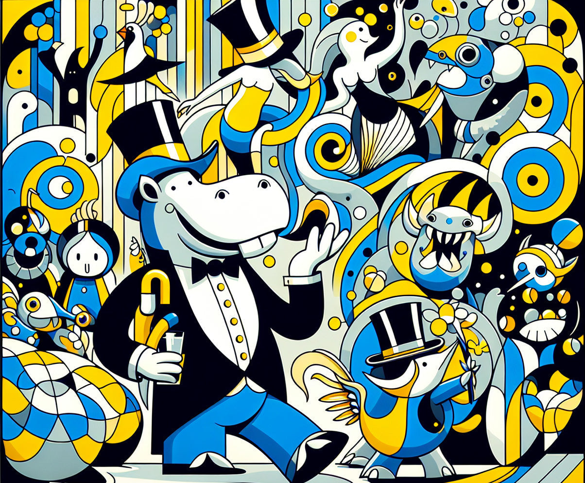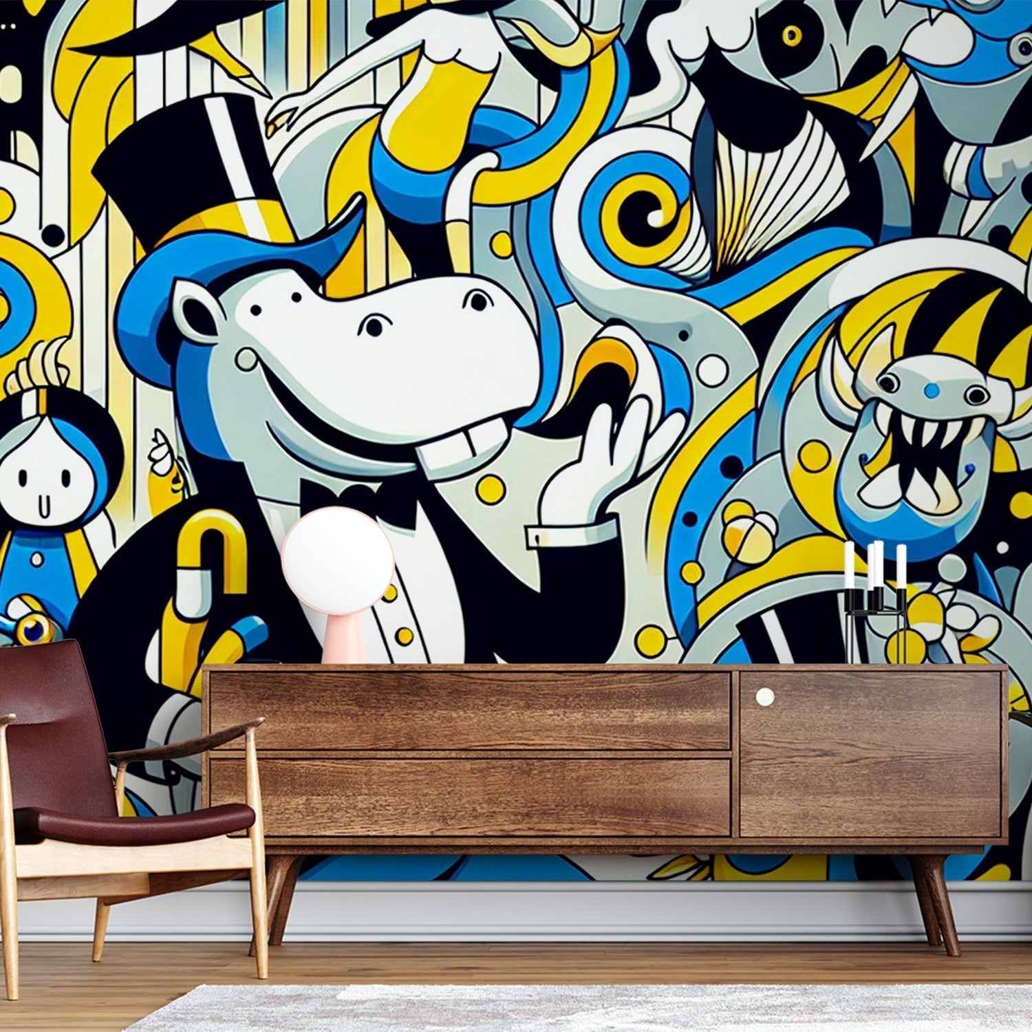 Diese Comic-Kunst-Tapete zeigt einen lebendigen Karneval von Charakteren, angeführt von einem charismatischen Nilpferd mit Zylinder und Smoking. Die dynamische Komposition sprüht vor Energie durch eine raffinierte Farbpalette aus Blau, Gelb, Schwarz und Weiß. Wirbelnde Muster und geometrische Formen schaffen einen faszinierenden Hintergrund für die Pop-Art-Tapete, während verspielte Figuren und spiralförmige Motive über die Oberfläche tanzen und eine Feier des künstlerischen Ausdrucks darstellen.