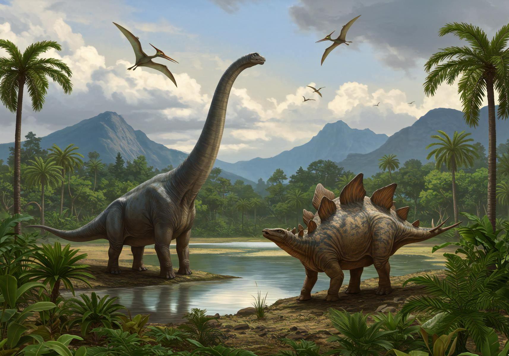 Diese Dinosaurier-Wandtapete versetzt Betrachter in eine prächtige Jurazeit-Landschaft, in der urzeitliche Riesen frei umherstreifen. Ein majestätischer Brachiosaurus steht hoch aufragend vor nebligen Bergen, während ein kraftvoller Stegosaurus am ruhigen Wasserufer grast. Anmutige Pterosaurier schweben durch wolkenverzogene Himmel, und üppige Palmen rahmen diese prähistorische Tapetenszene ein, die ein Fenster in die ferne Vergangenheit der Erde öffnet.