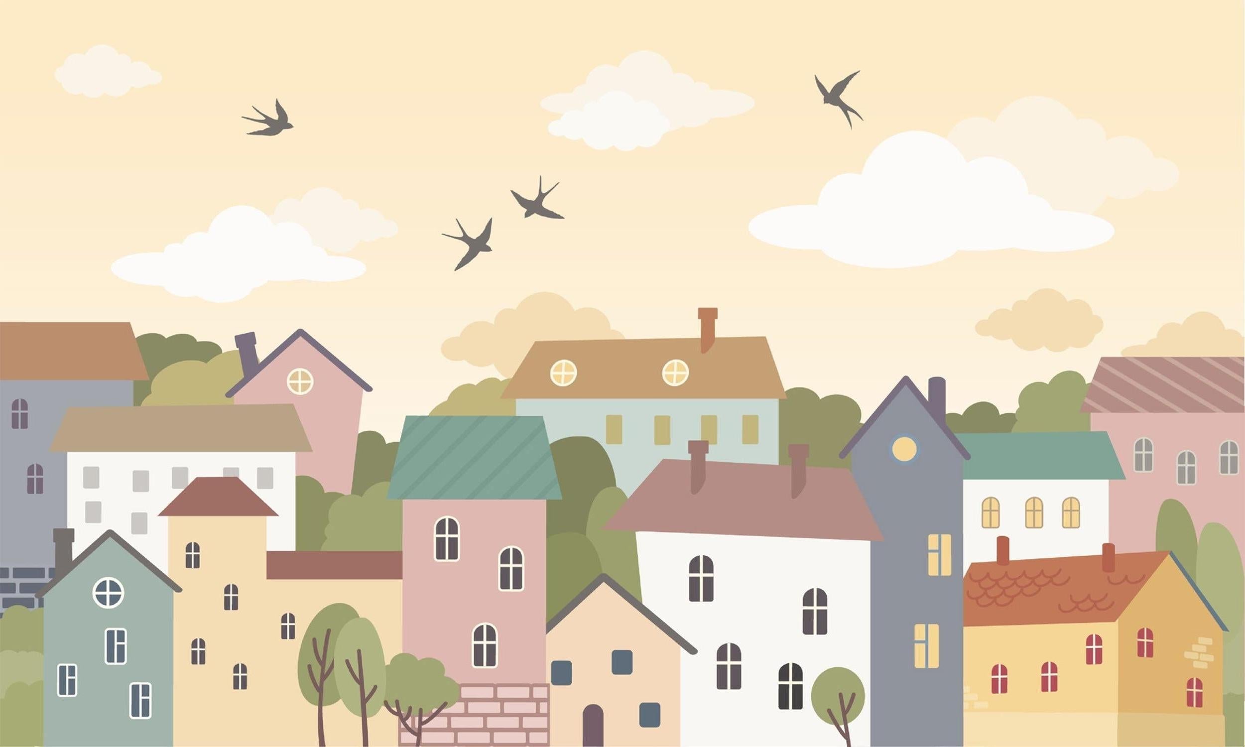 Dorf Tapete | Pastellhäuser mit fliegenden Vögeln