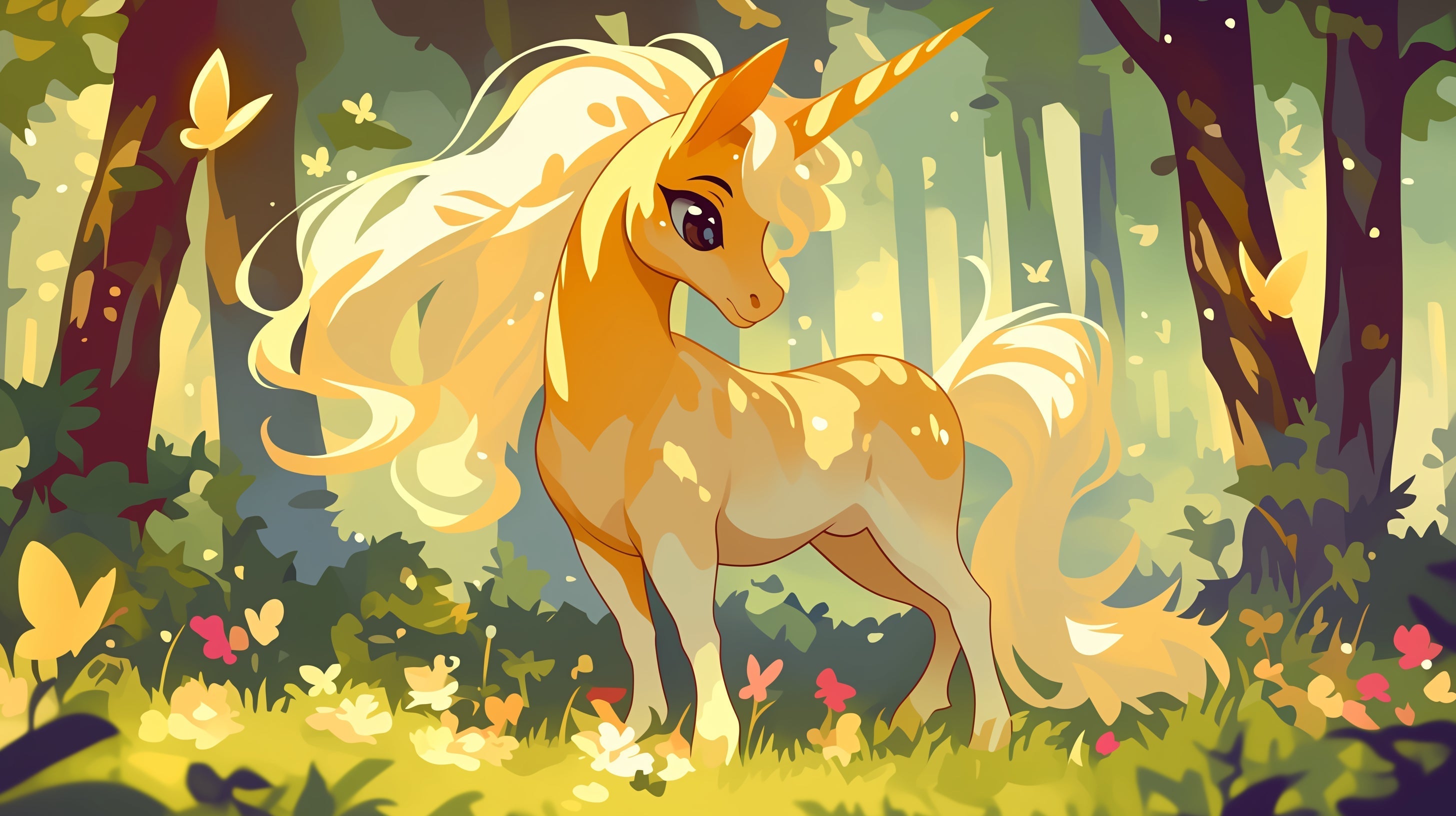 Dieses bezaubernde Einhorn-Wandbild zeigt ein goldenes mythisches Wesen in einer mystischen Waldlandschaft. Das majestätische Einhorn, dargestellt in warmen goldenen Tönen und mit cremefarbenem, fließendem Mähnenhaar, steht stolz vor einem Hintergrund aus ätherischen grünen Wäldern. Zarte Schmetterlinge tanzen durch die Szene, während magische Funken die Luft erfüllen und eine Atmosphäre des Staunens und der Verzauberung in diesem Fantasy-Waldtapete schaffen.