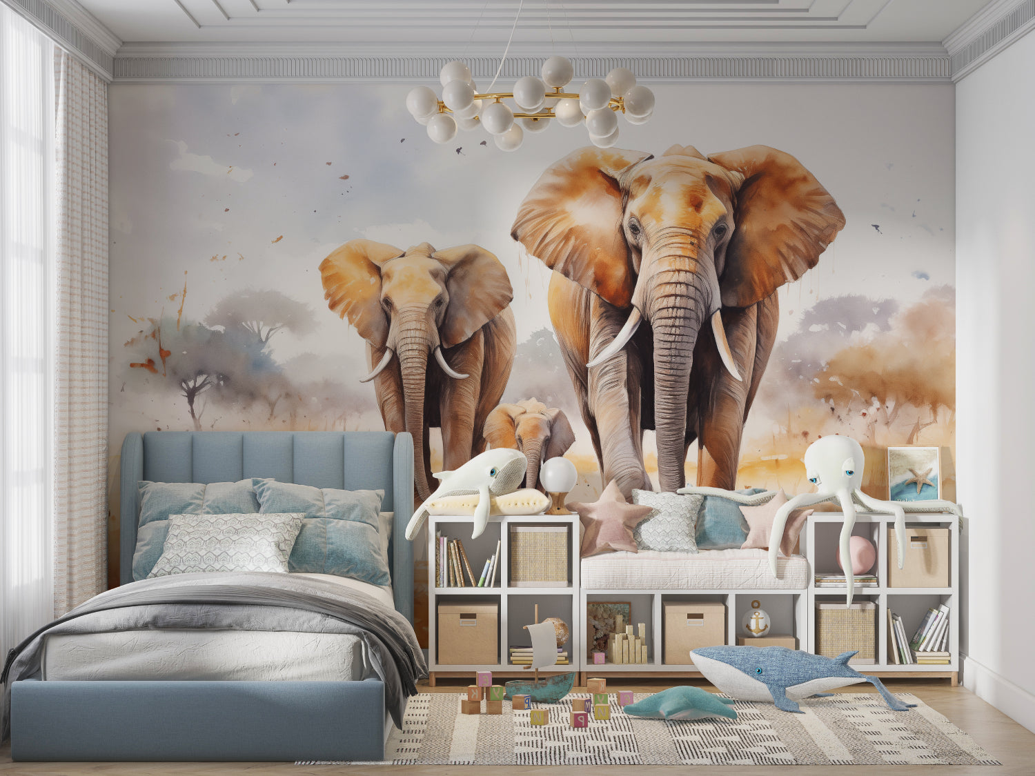Dieses Elefanten-Tapeten-Mural fängt die majestätische Schönheit der afrikanischen Tierwelt in einem sanften Aquarellstil ein. Das Kunstwerk zeigt eine zärtliche Familienszene von drei Elefanten, die durch die goldene Savanne wandern, deren warme Beige- und Terrakottatöne harmonisch mit dem nebligen Hintergrund verschmelzen. Die Safari-Tapete weist feine Details in den Gesichtsausdrücken und Texturen der Elefanten auf, während verstreute Blätter im sanften Wind tanzen und dieser ruhigen Komposition Bewegung verleihen.