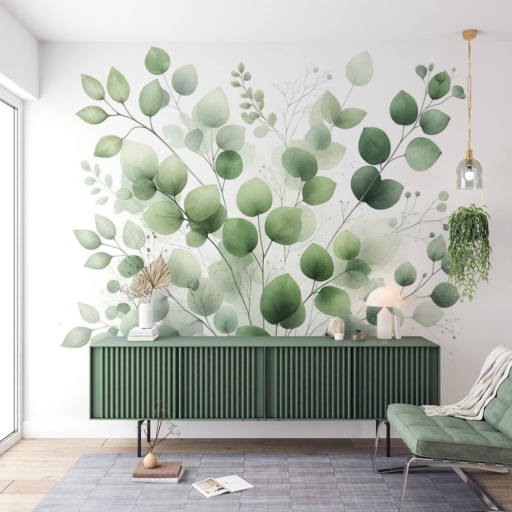 Diese Eukalyptusblatt-Tapete verwandelt Räume in friedliche Rückzugsorte.