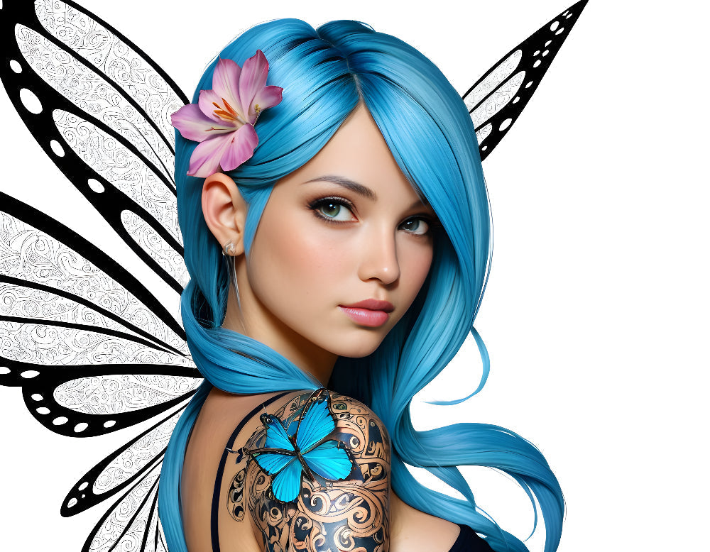 Dieses bezaubernde Feen-Wandbild zeigt ein faszinierendes Porträt mit ätherischen schwarz-weißen Schmetterlingsflügeln, die mit filigranen Schnörkelmustern verziert sind. Die Komposition präsentiert leuchtend blaues Haar, geschmückt mit einer zarten rosa tropischen Blume, die einen auffälligen Kontrast zum klaren Hintergrund bildet. Ein fantastisches Schmetterlings-Tapetenbild, das zeitgenössische Kunst mit mystischen Elementen durch sein detailliertes Tattoo-Design und seine anmutige Ästhetik verbindet.