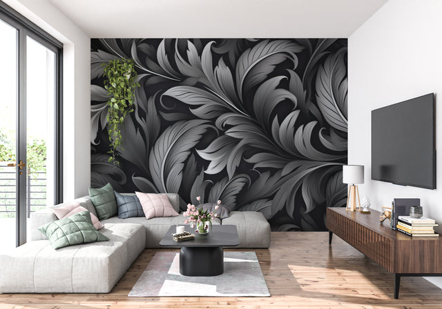 Verwandeln Sie Ihren Raum mit dieser modernen Feder-Tapete, die jedem Interieur Tiefe und architektonisches Interesse verleiht. Das schwarz-graue Wandbild dient als eindrucksvoller Hintergrund, der mühelos sowohl zeitgenössische als auch klassische Möbelstücke aufwertet und somit eine vielseitige Wahl für Wohnräume, Schlafzimmer oder Akzentwände darstellt. Seine monochrome Farbpalette schafft ein Gefühl von Eleganz, während das dynamische Muster Bewegung und visuelles Interesse in Ihre Umgebung bringt.