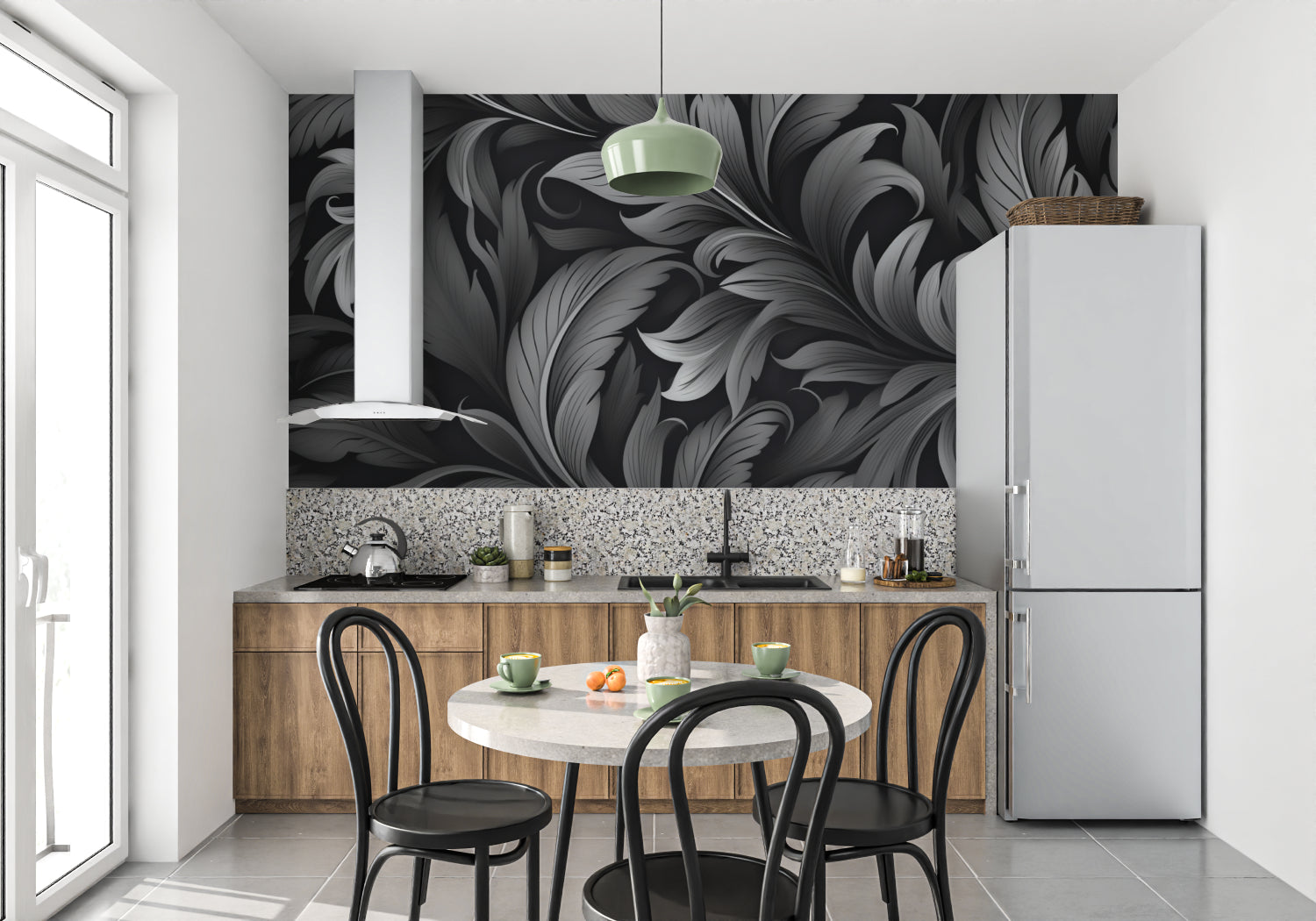 Die schwarze und graue Tapete schafft Tiefe und hält dabei die Räume hell und offen.