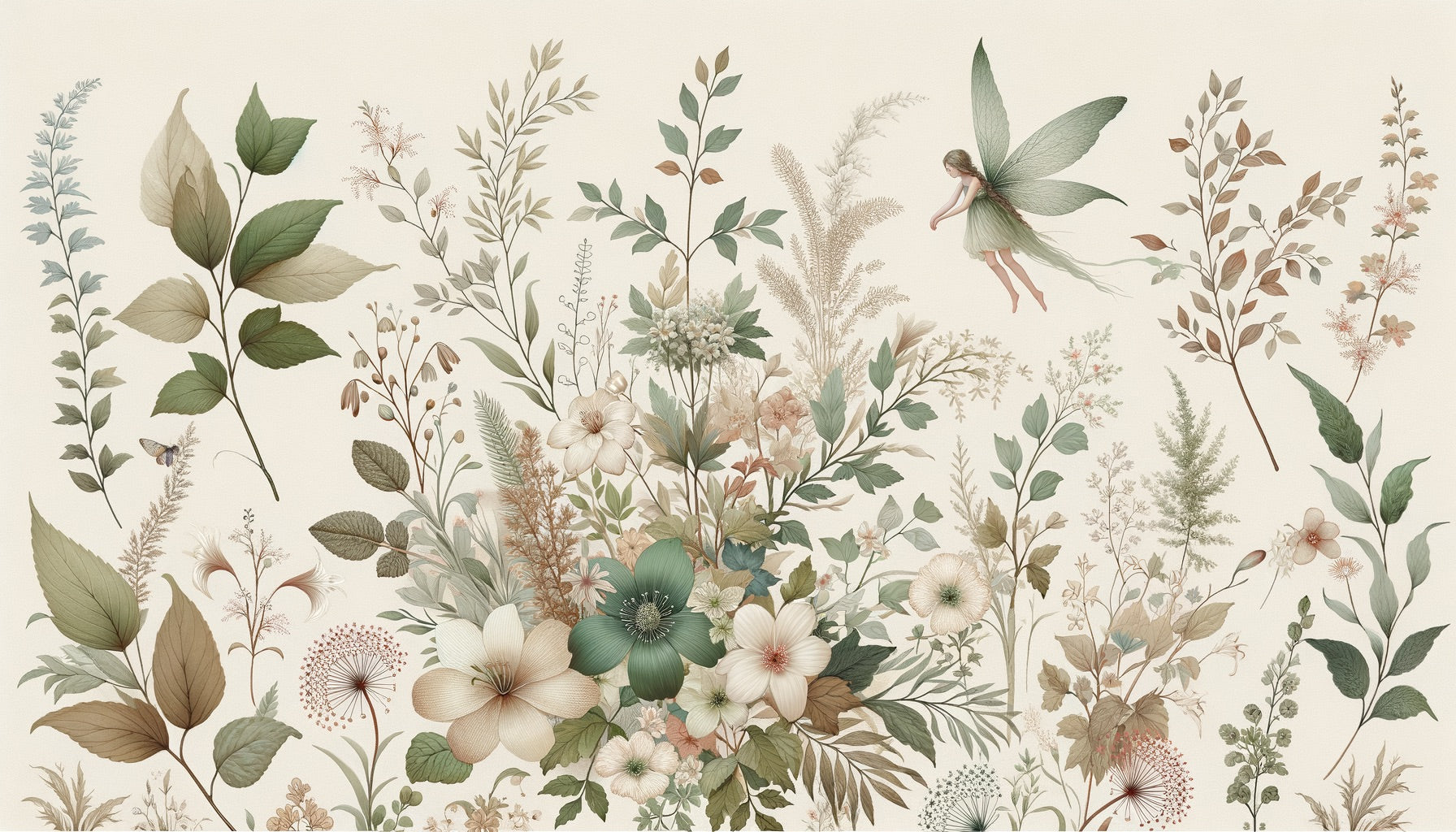 Diese Feengarten-Tapete schafft mit ihrer zarten Aquarellkunst ein bezauberndes botanisches Wunderland. Üppige grüne Nieswurz und cremefarbene Blüten tanzen zwischen weichem beigem Laub, während ein verspielter Kobold mit durchscheinenden Flügeln anmutig durch den Garten schwebt. Die botanische Tapete zeigt eine elegante Komposition aus detaillierten Blättern, Pusteblumen und zarten Blumen in einer harmonischen Palette aus Salbeigrün, warmem Beige und sanften Erdtönen.