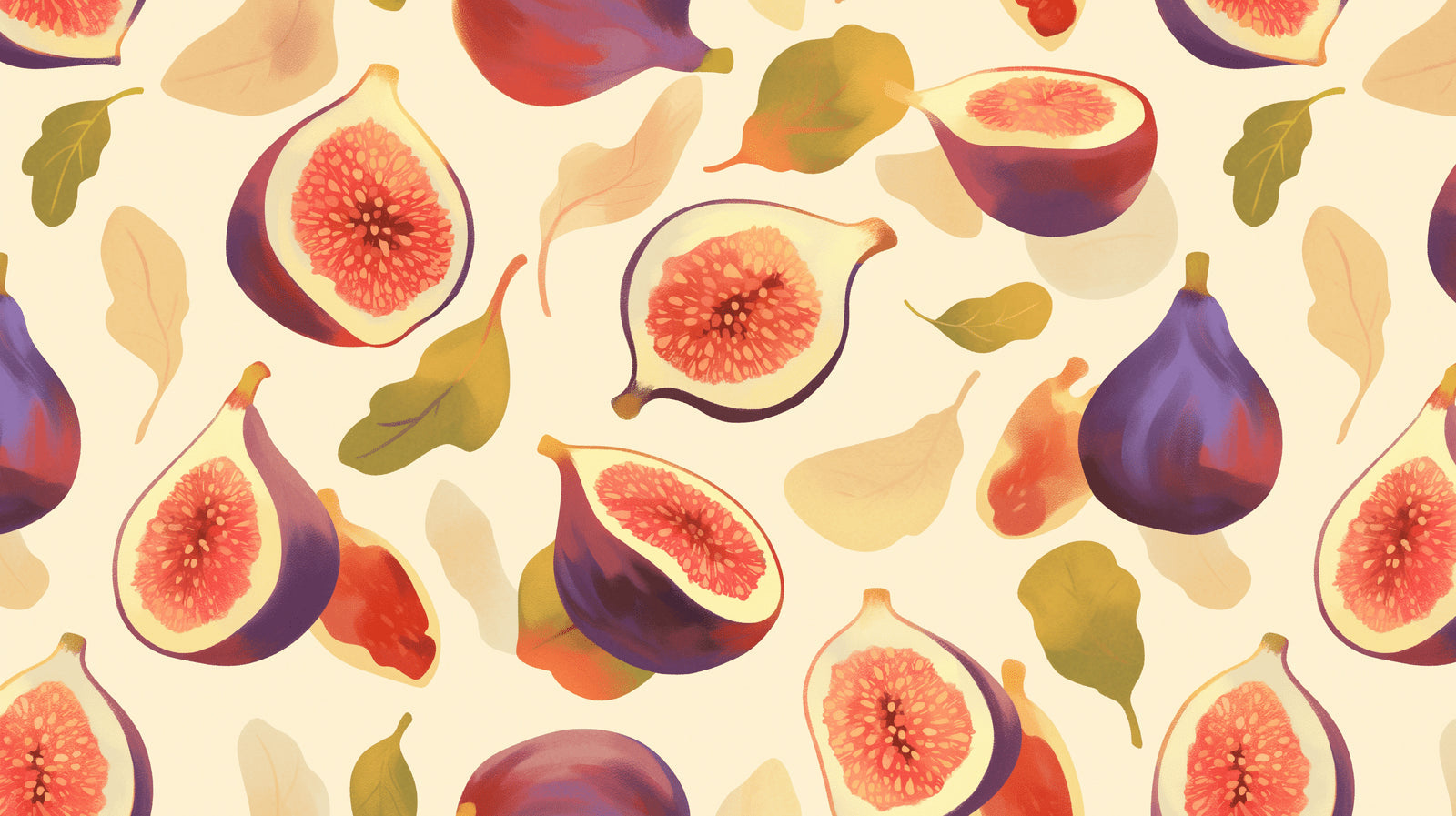Diese Feigenfrucht-Tapete zeigt eine faszinierende Anordnung wunderschön dargestellter Feigen in satten Violetttönen, aufgeschnitten, um ihre komplexen korallenrosa Innenflächen zu enthüllen. Vor einem warmen cremefarbenen Hintergrund zeigt das Design verstreute olivgrüne Blätter, die dem Muster eine organische Bewegung verleihen. Die mediterrane Tapeten-Komposition balanciert kräftige Fruchtillustrationen mit zarten botanischen Elementen und schafft ein anspruchsvolles Zusammenspiel von Maßstab und Farbe.