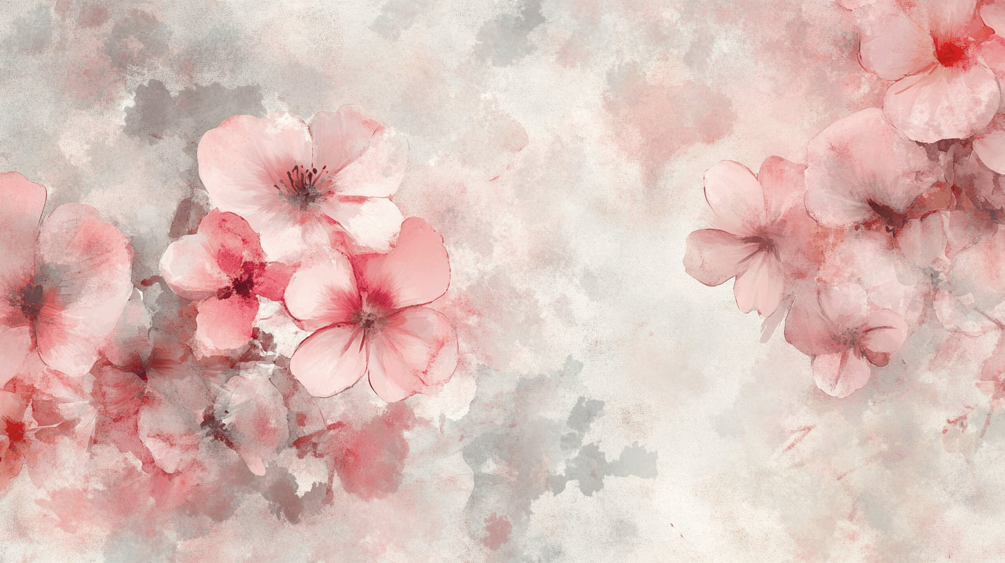 Diese Aquarell-Blumen-Tapete zeigt eine ätherische Komposition zarter rosa Blüten, die vor einem nebligen grauen Hintergrund schweben. Die weichblättrigen Blumen entstehen aus sanften Farbwäschen, ihre durchscheinenden Schichten schaffen Tiefe und Bewegung an der Wand. Jede rosa Blumen-Tapete-Blüte ist meisterhaft in Aquarelltechnik dargestellt, mit subtilen Farbverläufen von reinem Weiß bis zu tiefen Rosézentren, während rauchige graue Untertöne eine raffinierte Dimension hinzufügen.