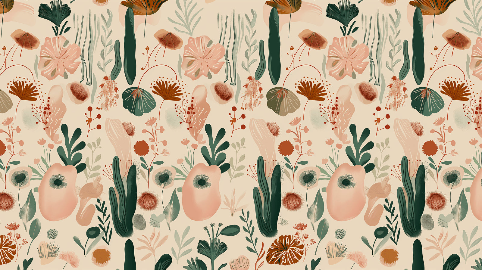 Diese moderne Blumen-Tapete zeigt eine bezaubernde Komposition abstrakter botanischer Elemente in einer anspruchsvollen Farbpalette. Smaragdgrüne Kakteen und zarte Wedel verweben sich mit sanftrosa Blüten und Terrakotta-Akzenten vor einem warmen beigen Hintergrund. Das botanische Wandbild bietet eine künstlerische Mischung aus geometrischen und organischen Formen, von fächerartigen Blättern bis zu kreisförmigen Blüten, die einen harmonischen Rhythmus schaffen, der sich über die Wand erstreckt.