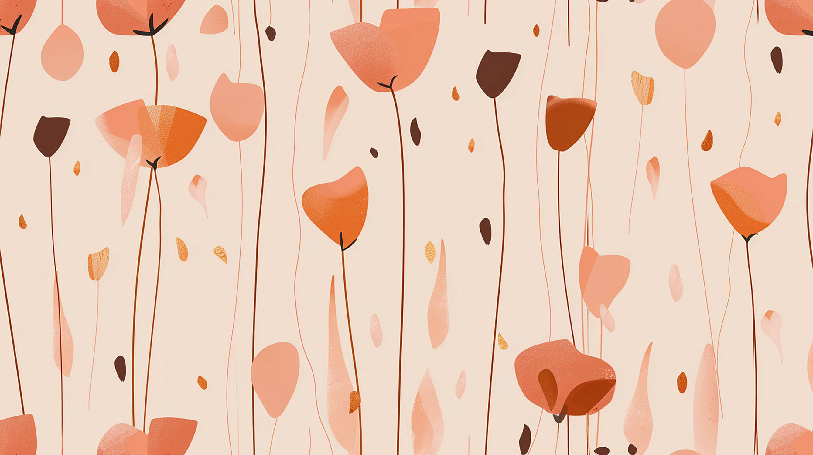 Diese abstrakte Blumen-Tapete zeigt eine anmutige Anordnung von terrakottafarbenen Blüten, die vor einem warmen beigen Hintergrund schweben. Zarte Stängel tragen stilisierte Blütenköpfe in verschiedenen Korallen- und Rosttönen, während verstreute goldene Akzente einen Hauch von Schimmer hinzufügen. Das moderne Blumendesign schafft ein rhythmisches Muster, das sich natürlich über die Wand erstreckt und künstlerischen Ausdruck mit zeitgenössischer Raffinesse verbindet.