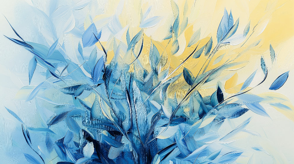 Diese künstlerische Blumen-Tapete zeigt eine faszinierende Reihe von blau getönten Blättern, die vor einem leuchtend gelben Hintergrund tanzen. Jeder Pinselstrich fängt die fließende Bewegung zarter Blätter ein und schafft eine dynamische Komposition, die mit ätherischer Anmut zu schweben scheint. Die moderne Blättertapete präsentiert verschiedene Schattierungen von Azur und Zyan, meisterhaft vermischt, um durch malerische Techniken Tiefe und Dimension zu erzielen.