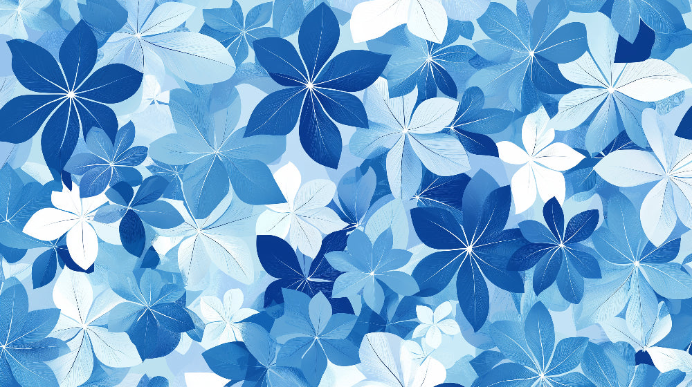 Diese blaue Blumen-Tapete zeigt eine elegante Anordnung von übergroßen Blüten in einem atemberaubenden Farbverlauf von Blau. Das Design zeigt große sternförmige Blumen mit detaillierter Blütenblattarbeit, die von tiefem Marineblau bis zu reinem Weiß reichen und einen faszinierenden Schichteffekt erzeugen. Das moderne Blumen-Tapeten-Muster zeigt ein meisterhaftes Spiel von Licht und Schatten, wobei zarte Aderstrukturen jeder Blütenblattoberfläche Tiefe und Raffinesse verleihen.