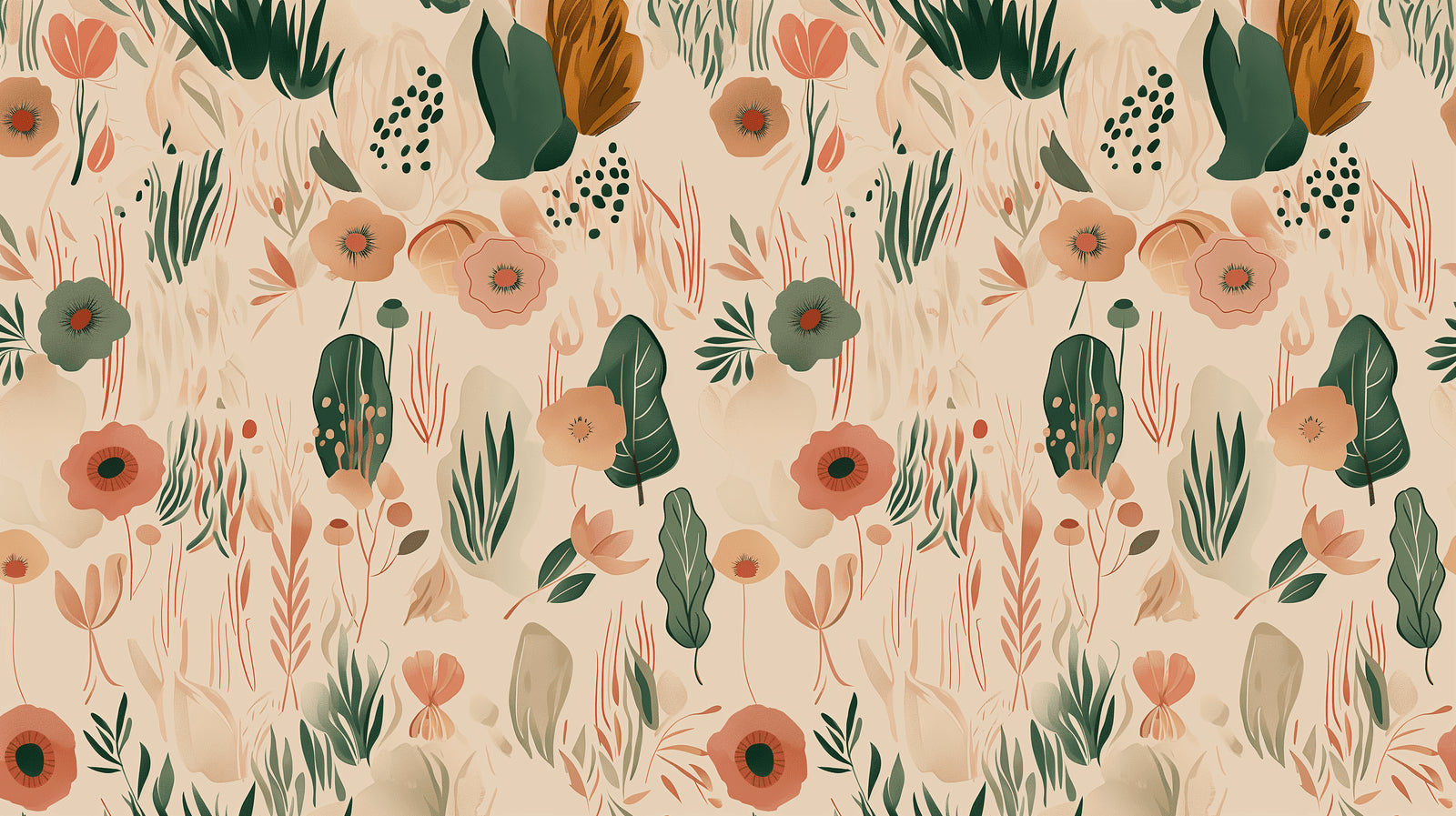 Diese botanische Tapete zeigt eine kunstvolle Mischung aus modernem Blumendesign und organischen Elementen. Tiefe smaragdgrüne Palmblätter und gepunktetes Laub schaffen ein rhythmisches Muster vor einem warmen beigen Hintergrund, während zarte Terrakotta-Blumen weiche, erdige Akzente in der gesamten Komposition setzen. Die künstlerische Anordnung von Blättern, Stielen und Blüten erzeugt ein anspruchsvolles Muster, das zeitgenössisches Design mit natürlichen Elementen verbindet.