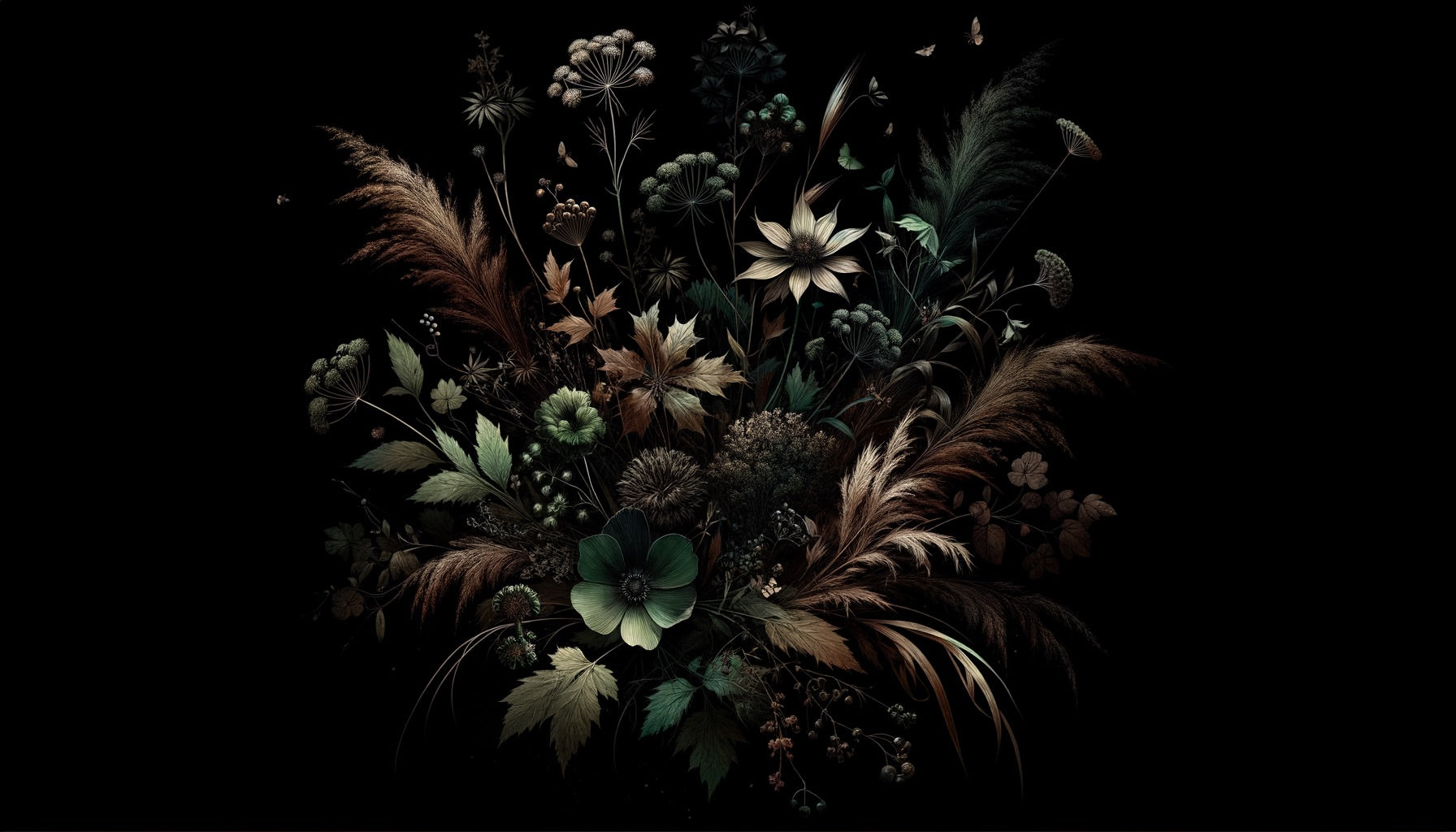 Diese dunkle Blumen-Tapete fängt die ätherische Schönheit eines Mitternachtsgartens ein, in dem zarte Wildblumen und federartige Stängel eine bezaubernde Komposition vor einem satten schwarzen Hintergrund schaffen. Die künstlerische Anordnung zeigt smaragdgrünes Laub, goldbraunes Pampasgras und salbeigrüne Blüten, alle sorgfältig detailliert, um die komplexen Muster der Natur zu präsentieren. Zarte Schmetterlinge flattern zwischen dem botanischen Tapetendesign und verleihen dieser anspruchsvollen Komposition Bewegung und Verspieltheit.