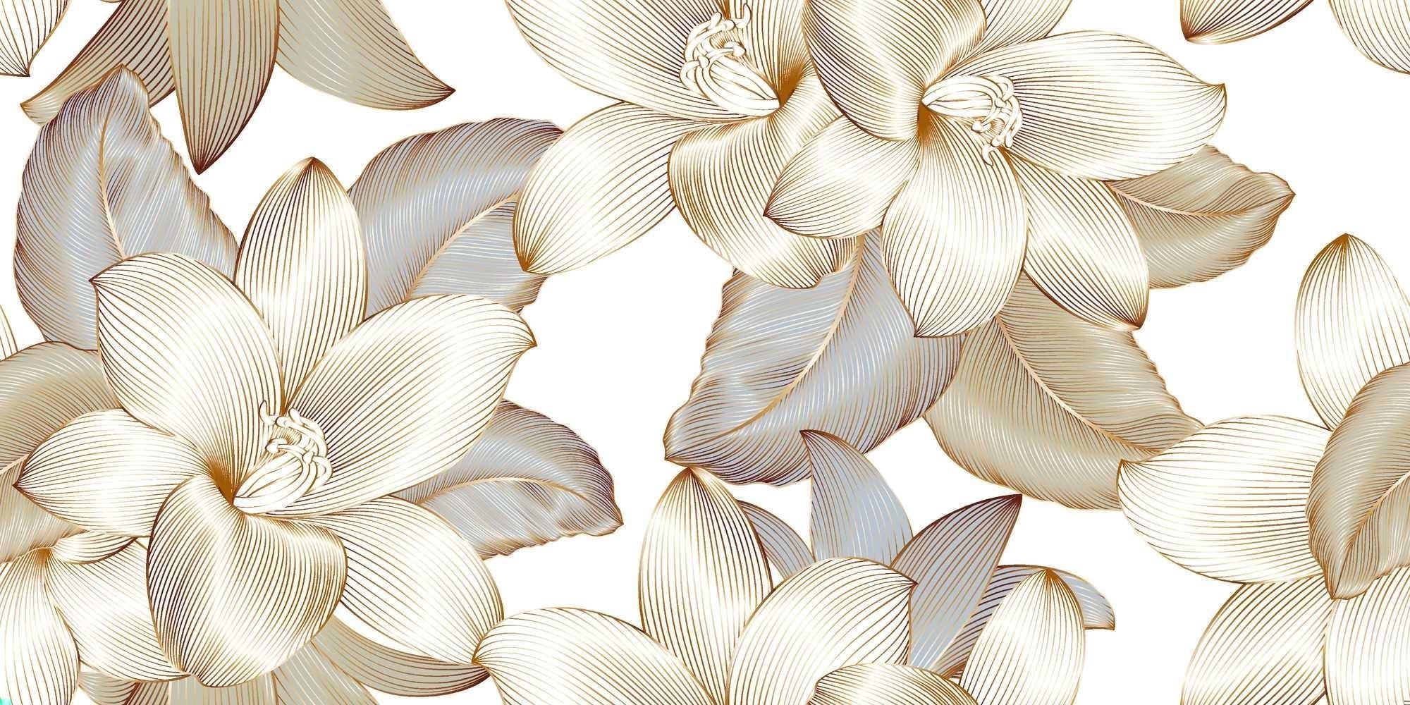 Diese luxuriöse Blumen-Tapete zeigt prächtige übergroße Blüten, dargestellt in raffiniertem goldgetöntem Linienkunststil vor einem makellosen weißen Hintergrund. Jedes Blütenblatt weist filigrane Rippen auf, die einen faszinierenden dreidimensionalen Effekt erzeugen, während die zarten goldenen Umrisse das Licht mit subtiler Brillanz einfangen und reflektieren. Die elegante botanische Tapete verbindet künstlerische Präzision mit natürlicher Anmut, da die großformatigen Blumen in einer harmonischen Komposition überlappen.