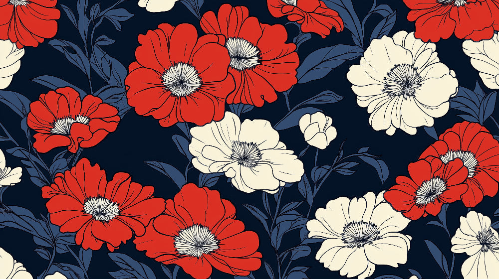 Blumen-Tapete | Kräftige rote und weiße Blüten auf Marineblau