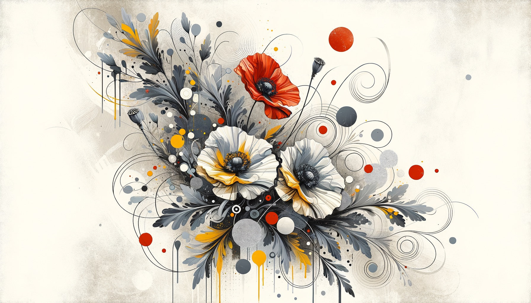 Diese moderne Blumen-Tapete zeigt eine dramatische botanische Komposition, bei der weiße Anemonen und ein lebhafter roter Mohn im Mittelpunkt stehen. Das künstlerische Design kombiniert graues Laub mit Akzenten in Goldgelb und schafft ein elegantes Farbenspiel. Zarte wirbelnde Linien und schwebende Kreise fügen dem künstlerischen Blumen-Wandbild ein zeitgenössisches abstraktes Element hinzu, während der neutrale beige Hintergrund eine anspruchsvolle Leinwand für dieses botanische Meisterwerk bietet.