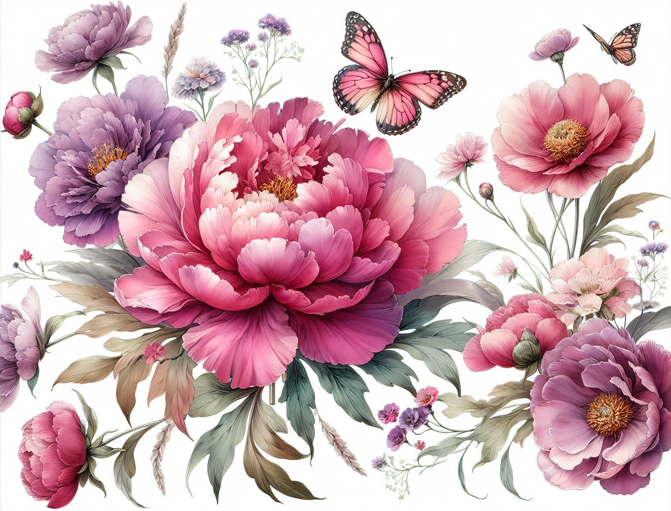 Dieses florale Wandbild zeigt eine bezaubernde Anordnung von übergroßen Pfingstrosen in satten Pink- und Lilatönen, begleitet von zarten Monarchfalter, die über einen makellosen weißen Hintergrund tanzen. Die meisterhaft detaillierten Blüten offenbaren Schichten weicher Blütenblätter in verschiedenen Schattierungen, von tiefem Magenta bis zu sanftem Lavendel, während salbeigrünes Laub und goldbraune Blätter eine anspruchsvolle natürliche Komposition schaffen. Jedes Pfingstrosen-Tapetenelement ist mit außergewöhnlicher künstlerischer Präzision dargestellt und fängt die filigranen Texturen und subtilen Farbverläufe dieser beliebten Blumen ein.