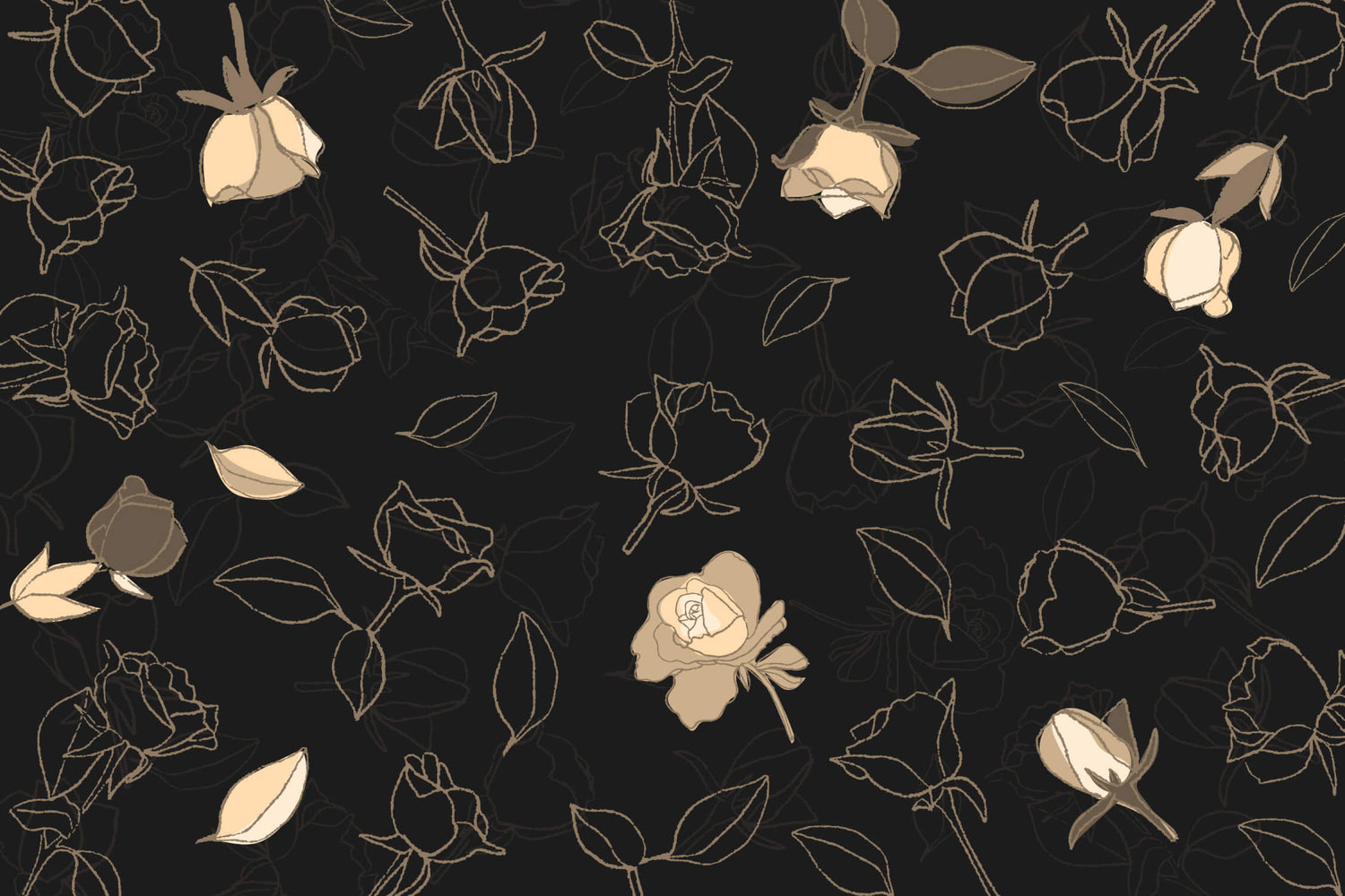 Diese schwarze Blumen-Tapete zeigt eine elegante Komposition zarter Rosenumrisse, die in edlem Gold vor einem satten schwarzen Hintergrund dargestellt sind. Die künstlerischen Linienzeichnungen schaffen ein Muster aus schwebenden Blüten und verstreuten Blättern und bringen eine zeitgenössische Interpretation klassischer botanischer Wandgemälde. Jede goldene Rosenskizze scheint über die tiefschwarze Oberfläche zu tanzen und erzeugt ein faszinierendes Spiel von Licht und Schatten.