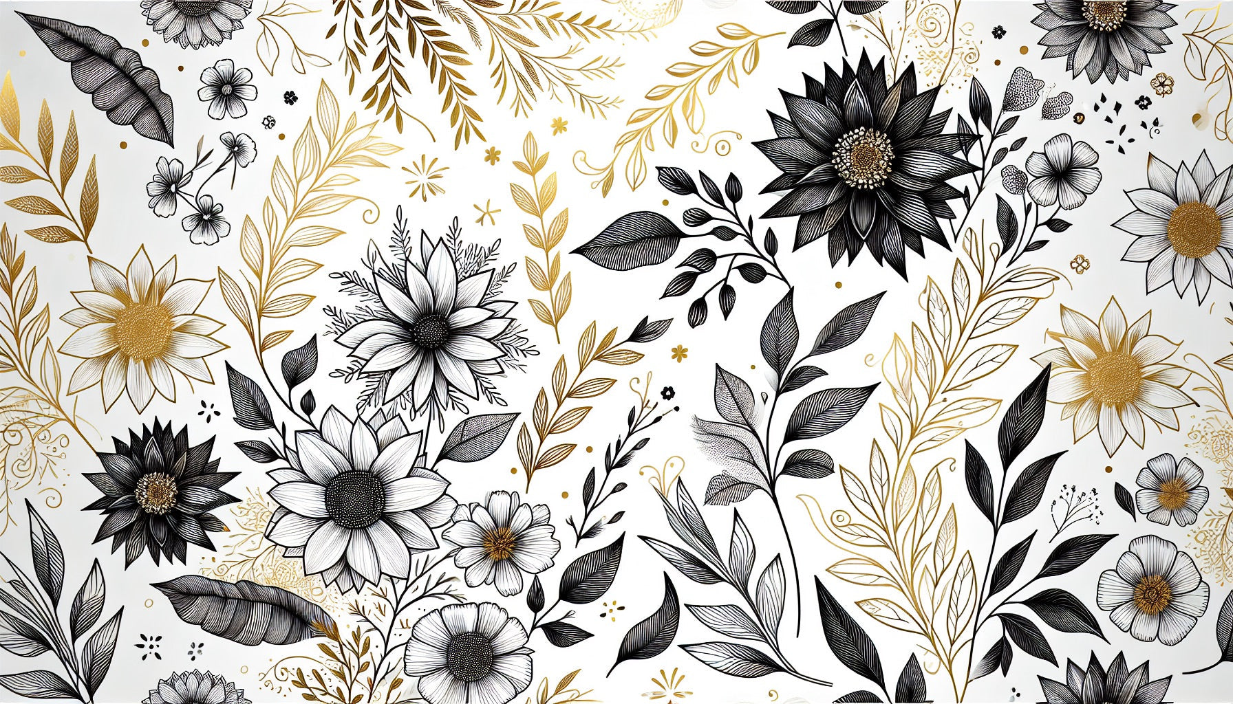 Diese schwarz-goldene Blumen-Tapete zeigt eine bezaubernde botanische Komposition, bei der dramatische schwarze Blüten mit zartem goldenem Laub vor einem makellosen weißen Hintergrund verschmelzen. Die filigranen Linienkunst-Details der botanischen Tapete schaffen ein raffiniertes Spiel von Texturen, von kräftigen sonnenblumenähnlichen Blüten bis hin zu anmutigen Blättern und zarten Zweigen, jedes Element sorgfältig in einer auffälligen monochromen Palette mit metallischen Goldakzenten dargestellt.