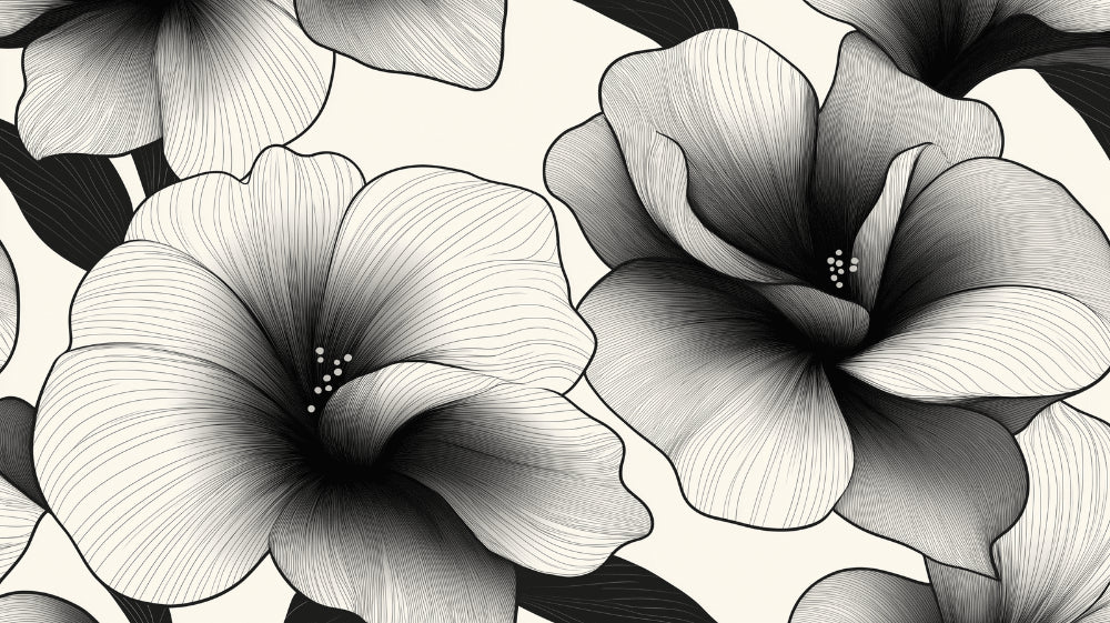 Diese schwarz-weiße Blumen-Tapete zeigt prächtige übergroße Hibiskusblüten, die in auffälligen monochromen Details dargestellt sind. Die filigrane Linienführung erzeugt einen faszinierenden Tiefeneffekt, mit zarten Streifen, die durch jedes Blütenblatt fließen. Das großformatige Blumen-Mural verfügt über meisterhaft ausgeführte Schattierungen, die von reinem Weiß bis tiefem Schwarz übergehen, während der cremefarbene Hintergrund eine weiche, elegante Grundlage für das dramatische botanische Kunstwerk bietet.