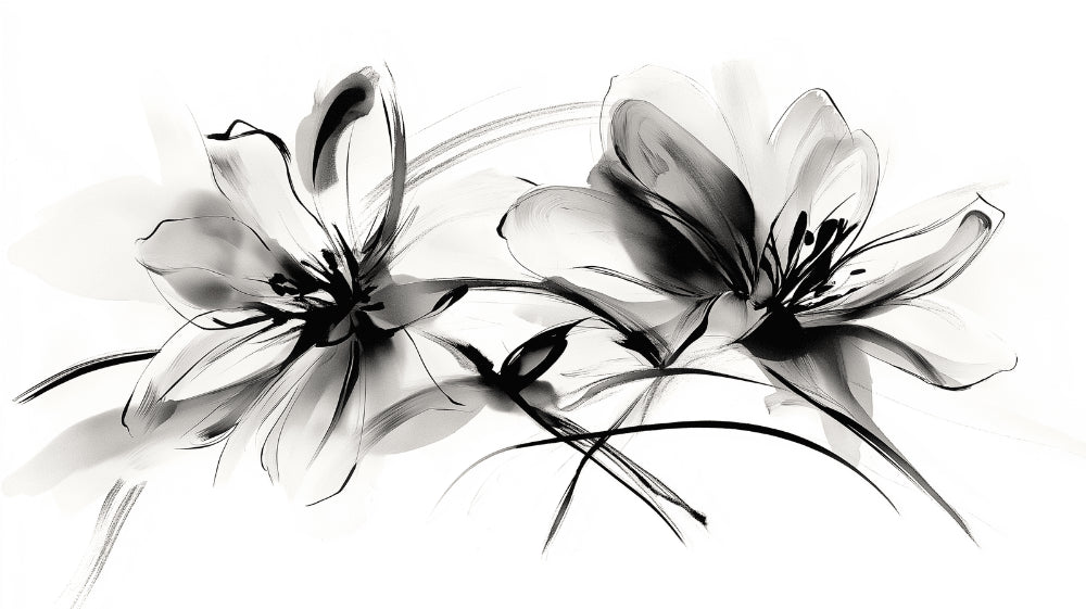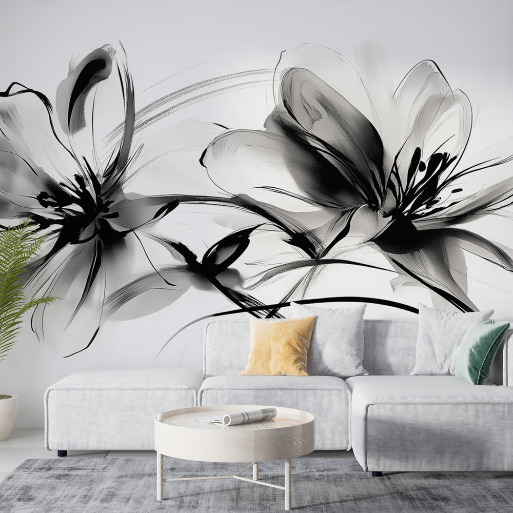 Diese schwarz-weiße Blumen-Tapete zeigt eine künstlerisch gestaltete Komposition anmutiger Blüten, meisterhaft ausgeführt in dramatischer Tuschewaschtechnik. Die ätherischen Blumen treten aus dem makellosen Hintergrund hervor mit kräftigen, fließenden Pinselstrichen, die sowohl Stärke als auch Zartheit einfangen. Jedes abstrakte Blumenwandbild-Element zeigt bemerkenswerte Detailgenauigkeit, von der dynamischen Bewegung der Blütenblätter bis zu den anmutig geschwungenen Stielen, und schafft einen harmonischen Tanz von Licht und Schatten.
