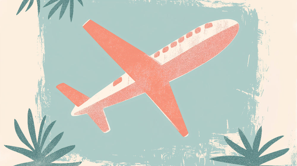 Dieses Flugzeug-Wandbild fängt eine retro-moderne Ästhetik ein mit seinem stilisierten, korallenfarbenen Flugzeug, das vor einem ruhigen mintblauen Hintergrund fliegt. Das Design zeigt eine wunderschön gestaltete Vintage-Flugzeug-Tapete mit weißen Akzenten und markanten Fensterelementen, während tieftealfarbene tropische Blätter die Ecken einrahmen und ein künstlerisches Gleichgewicht zwischen Abenteuer und Ruhe schaffen. Die verwitterte Textur verleiht Charakter und Tiefe und gibt dem Design ein authentisches Vintage-Gefühl.