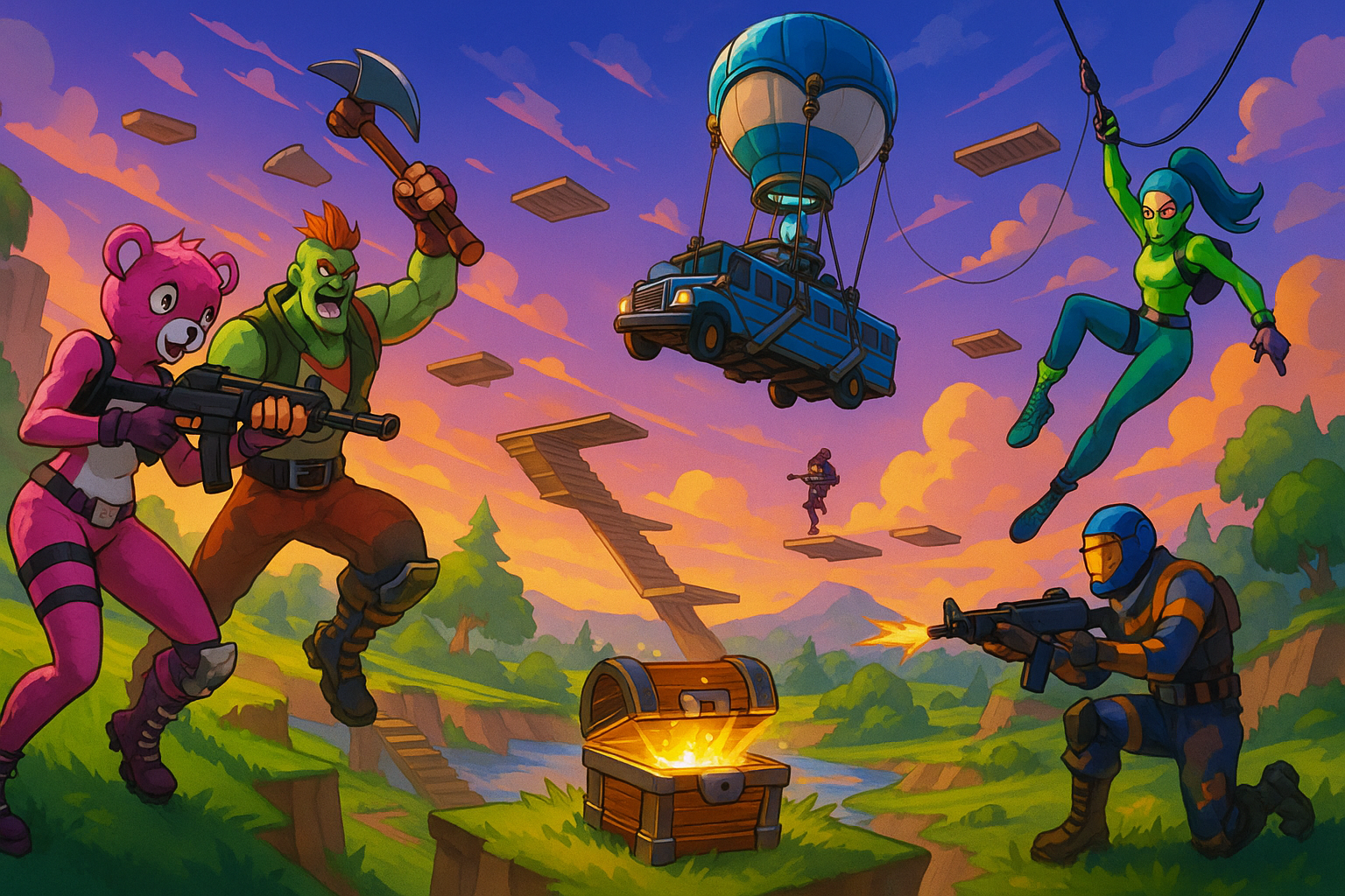 Dieses lebendige Gaming-Tapeten-Mural fängt die intensive Action einer Fortnite-Kampfszene vor einem spektakulären Sonnenuntergangshimmel ein. Dynamische Charaktere springen durch die Luft, umgeben von schwebenden Plattformen und einem mystischen Heißluftballon, der einen Battle Bus trägt. Die reiche Farbpalette zeigt tiefe Violett- und warme Orangetöne im Himmel, die wunderschön mit der üppig grünen Landschaft und der leuchtenden Schatztruhe im Zentrum des Fortnite-Wandmurals kontrastieren.