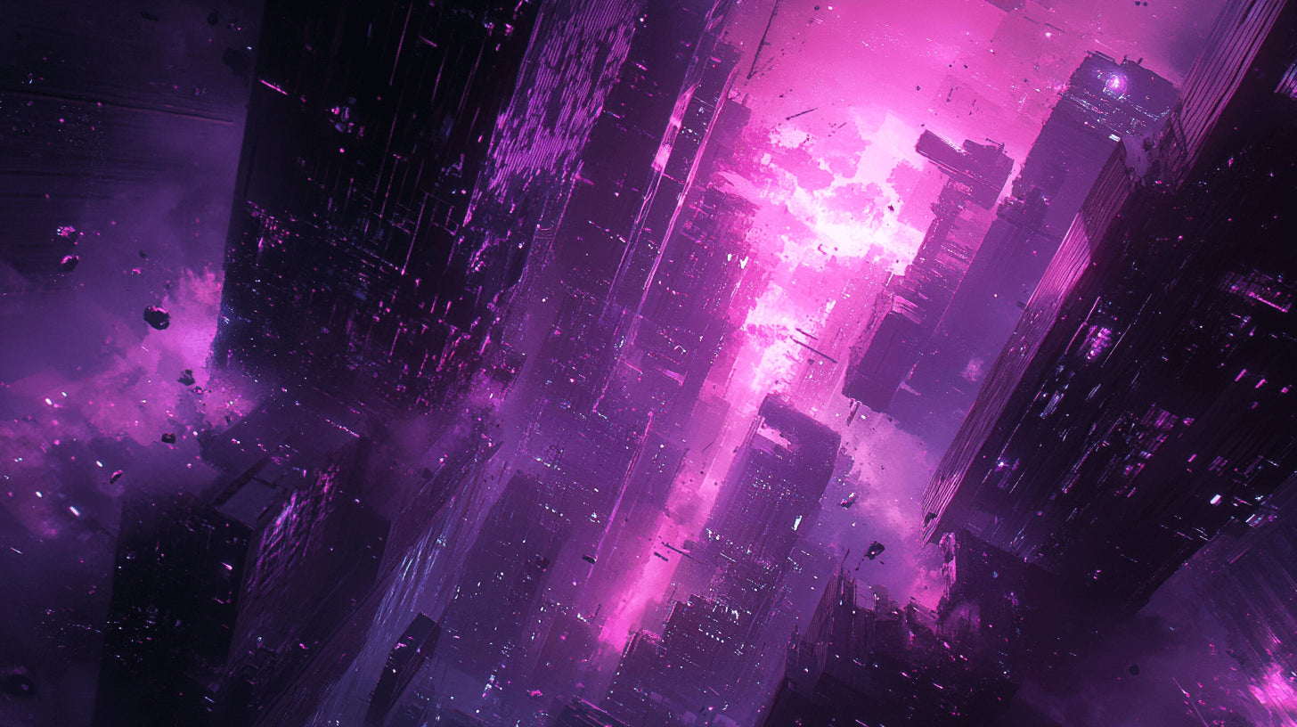 Dieses futuristische Gaming-Tapete zeigt eine eindringliche Stadtlandschaft, getaucht in lebendige neonviolette Farbtöne. Die dramatischen vertikalen Linien und digitalen Verzerrungen schaffen eine faszinierende Cyberpunk-Ästhetik, während das leuchtende pinke Glühen wie ein digitaler Sonnenaufgang durch die urbanen Silhouetten dringt. Die neon Stadtlandschaft Tapete kombiniert tiefe Violett- und elektrische Pinktöne in einer auffälligen Komposition, die das Wesen einer High-Tech-Metropole einfängt.