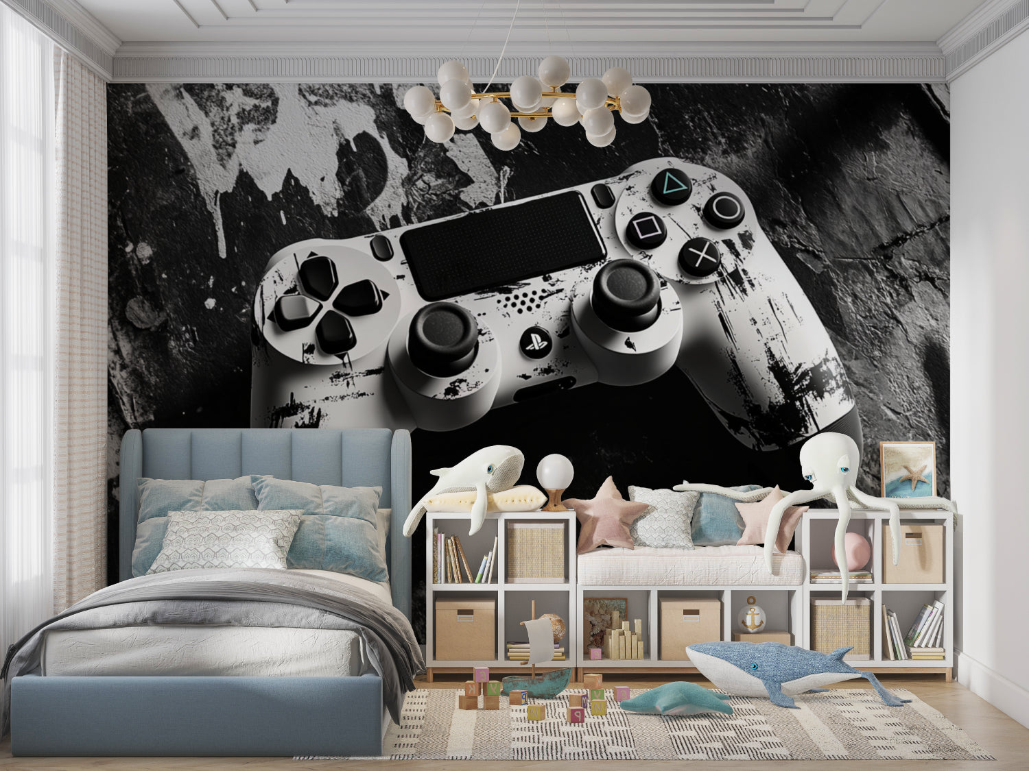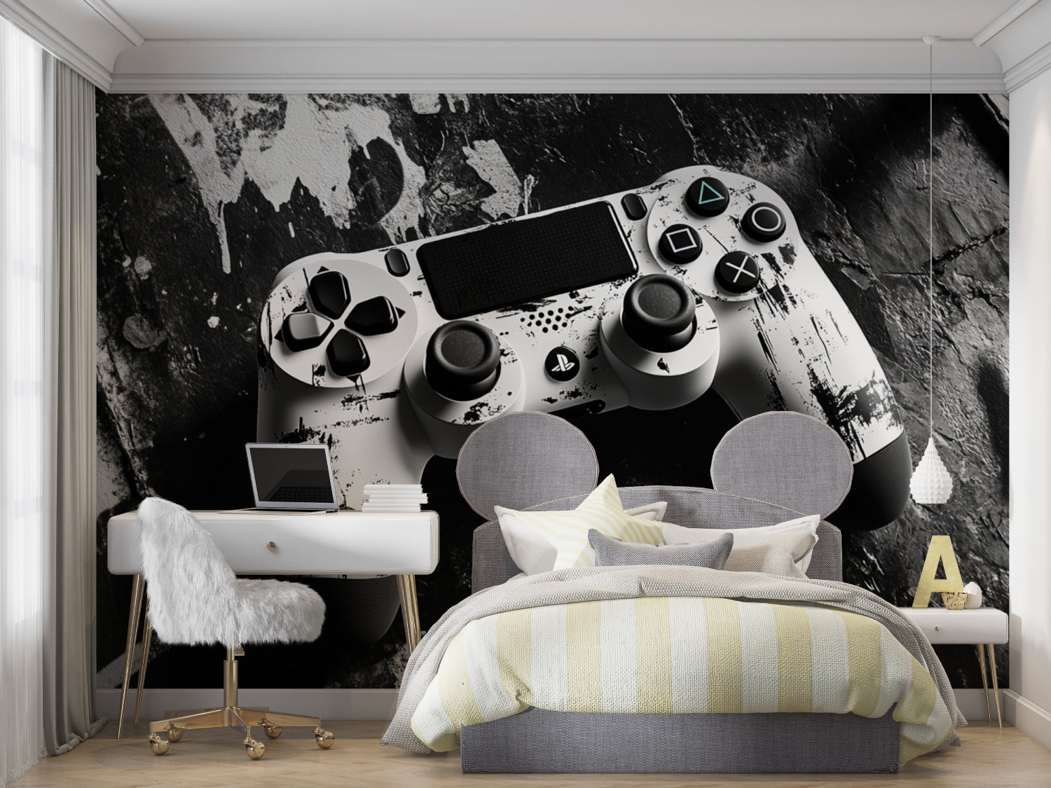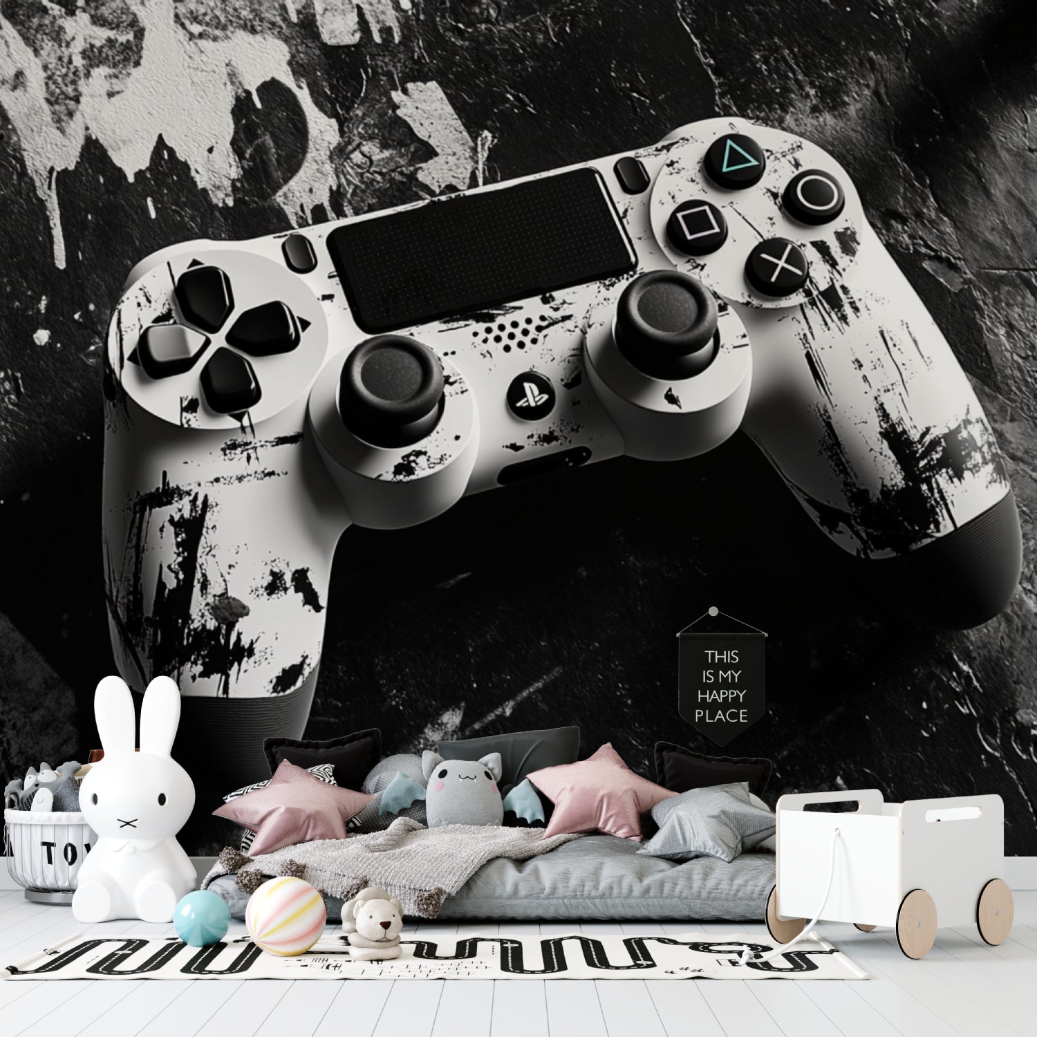 Dieses Gaming-Tapeten-Mural zeigt eine dramatische Schwarz-Weiß-Komposition mit einem ikonischen PlayStation-Controller und auffälligen Farbeffekt-Spritzern. Das monochrome Design schafft eine kühne visuelle Aussage, bei der jeder Knopf und jedes Detail der Gaming-Controller-Tapete vor dem strukturierten Hintergrund hervorsticht und ein beeindruckendes Gefühl von Tiefe und Dimension erzeugt. Die künstlerische Darstellung verbindet urbane Ästhetik mit Gaming-Kultur auf eine anspruchsvolle Weise.